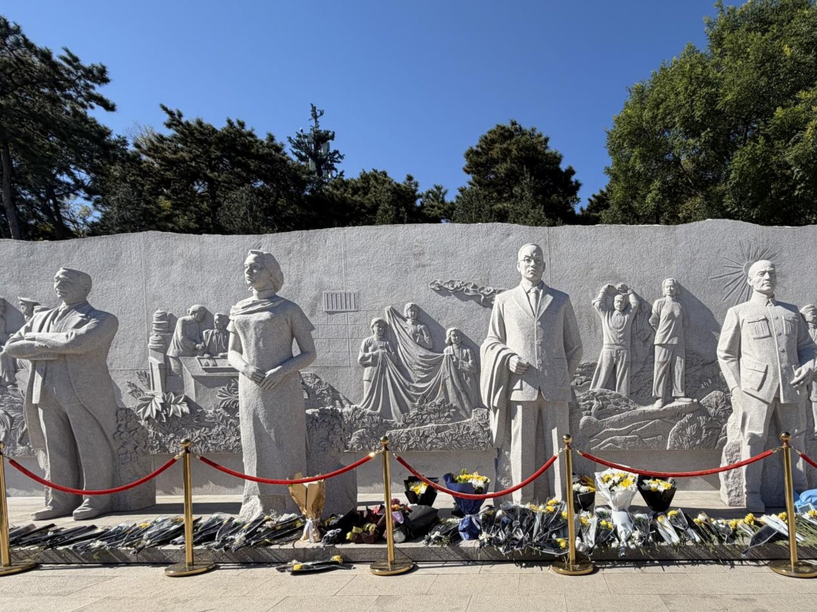 无名英雄纪念广场上,前来缅怀的游客们在雕像前献上花束祭奠。(未来网记者 摄)