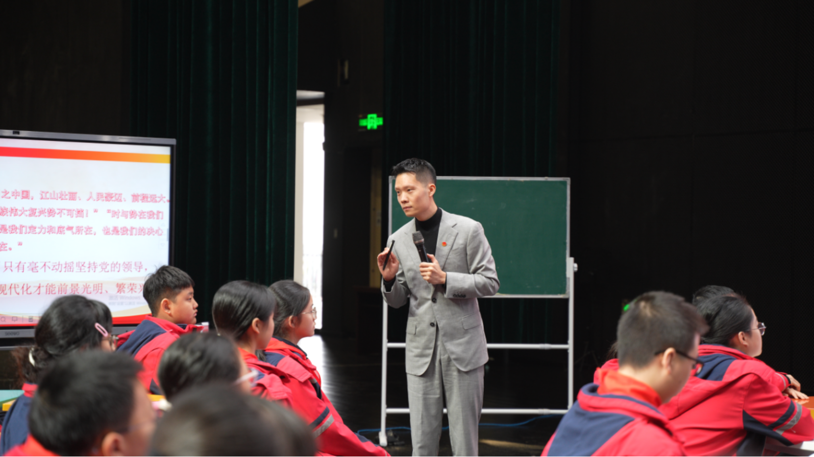 在四川省宜宾市第一中学校,团中央青年讲师团成员、团四川省委青年讲师团成员、宜宾职业技术学院团委干部刘宇超以“‘桥’见你好——从基建奇迹到科技浪潮,解码‘十四五’的青春力量”为宣讲主题,通过一架架横跨江河、穿越山海的“桥”,将“十四五”期间我国基础设施建设和科技方面取得的实质性成就讲给孩子们听。