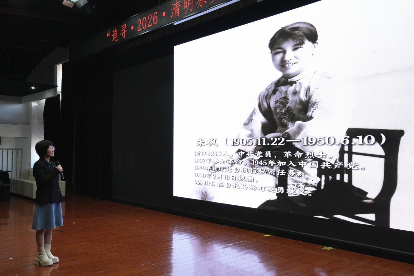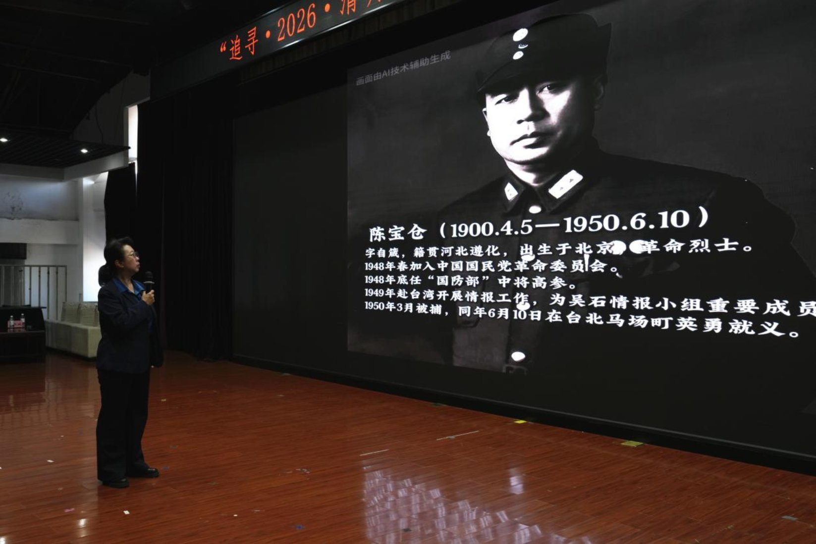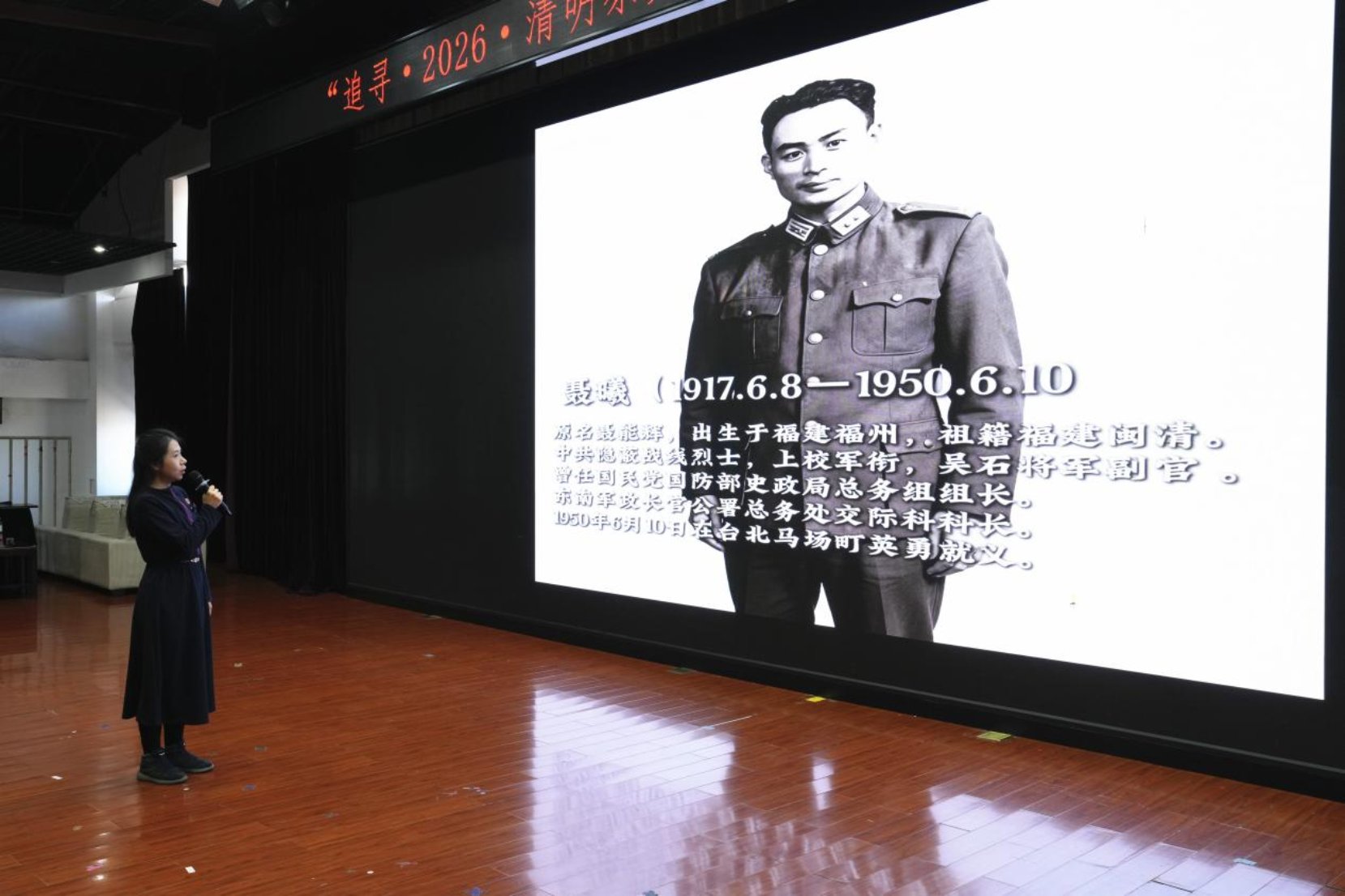 主题活动现场,李克农将军之孙李凯城担任主持嘉宾,朱枫烈士孙女朱容瑢、陈宝仓烈士外孙女李敏、聂曦烈士侄孙女黄怡然三位烈士后代,以平实而深情的讲述,带领师生们重温先辈们在隐蔽战线上的忠诚与牺牲:朱枫三进上饶集中营营救战友、变卖嫁妆支援革命,最终赴台取回战略防御图,被捕时吞金自尽未果,高呼“中国共产党万岁”慷慨赴死;陈宝仓从抗日战场转向潜伏使命,亲手绘制台湾兵力部署图,牺牲前从容自若;聂曦凭借过人机智护送绝密档案,就义时身着白衣,傲骨挺立。