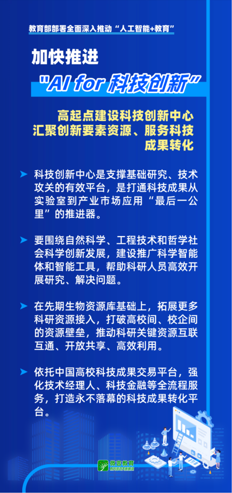 未来网北京4月2日电(记者 张冰清)3月31日,教育部召开国家教育数字化战略行动2026年部署会。面向“十五五”时期,教育部部署全面深入推动“人工智能+教育”,提出要加快推进“AI for科技创新”,高起点建设科技创新中心,汇聚创新要素资源、服务科技成果转化。并明确“科技创新中心是支撑基础研究、技术攻关的有效平台,是打通科技成果从实验室到产业市场应用‘最后一公里’的推进器。”“依托中国高校科技成果交易平台,强化技术经理人、科技金融等全流程服务,打造永不落幕的科技成果转化平台。”