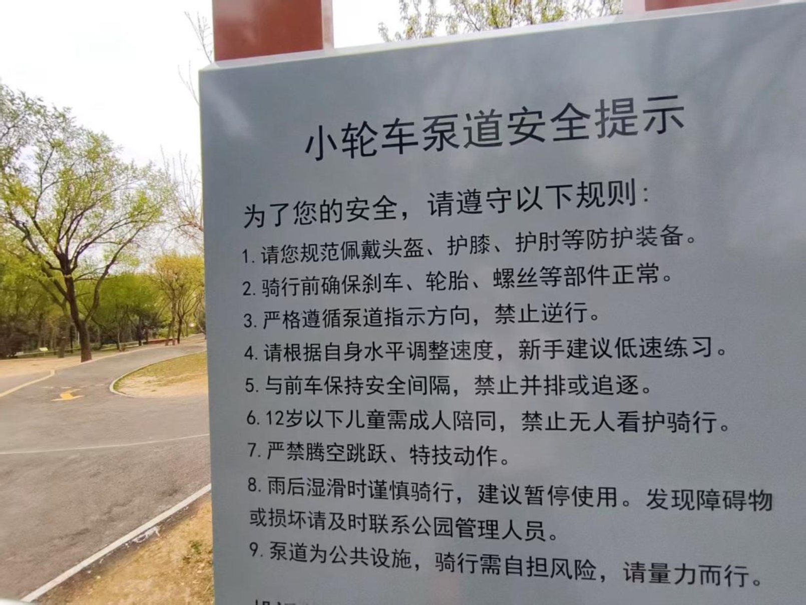 北京某处公园内的小轮车泵道安全提示牌。(未来网记者摄)