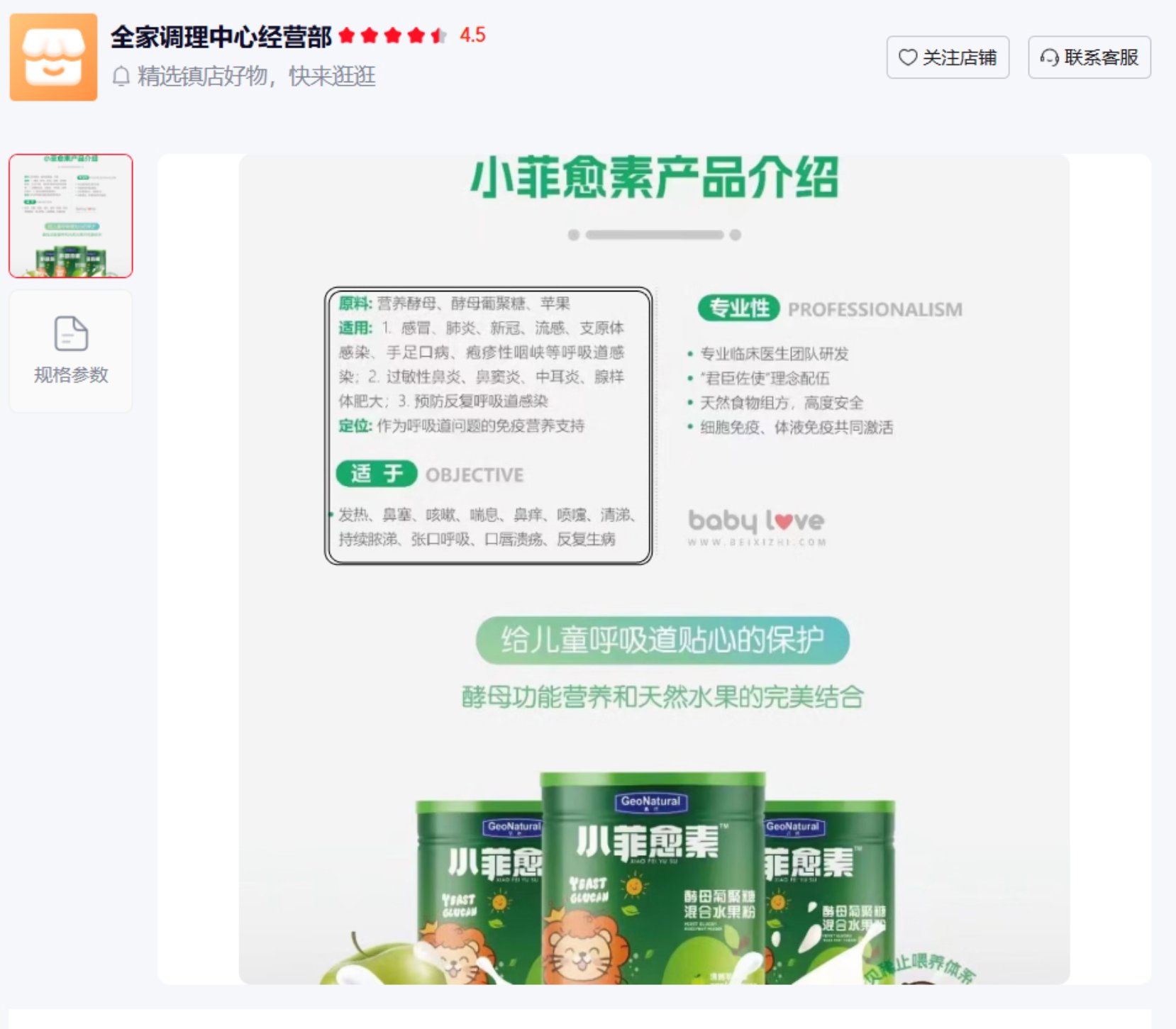 2026年1月27日,于女士家中1岁多的孩子出现轻微上呼吸道感染的情况,经朋友推荐,她在电商平台“全家调理中心经营部”店铺看到“晶然‘小菲愈素’酵母葡聚糖混合水果粉”的宣传,被其详尽的“功效介绍”打动。商家在产品页上明确标注了广泛的“适用范围”,声称可用于感冒、肺炎、新冠、流感、支原体感染、手足口病、疱疹性咽峡等各类呼吸道感染,还能针对过敏性鼻炎、鼻窦炎、中耳炎、腺样体肥大等疾病,甚至可预防反复呼吸道感染,将产品定位为“呼吸道问题的免疫营养支持”。