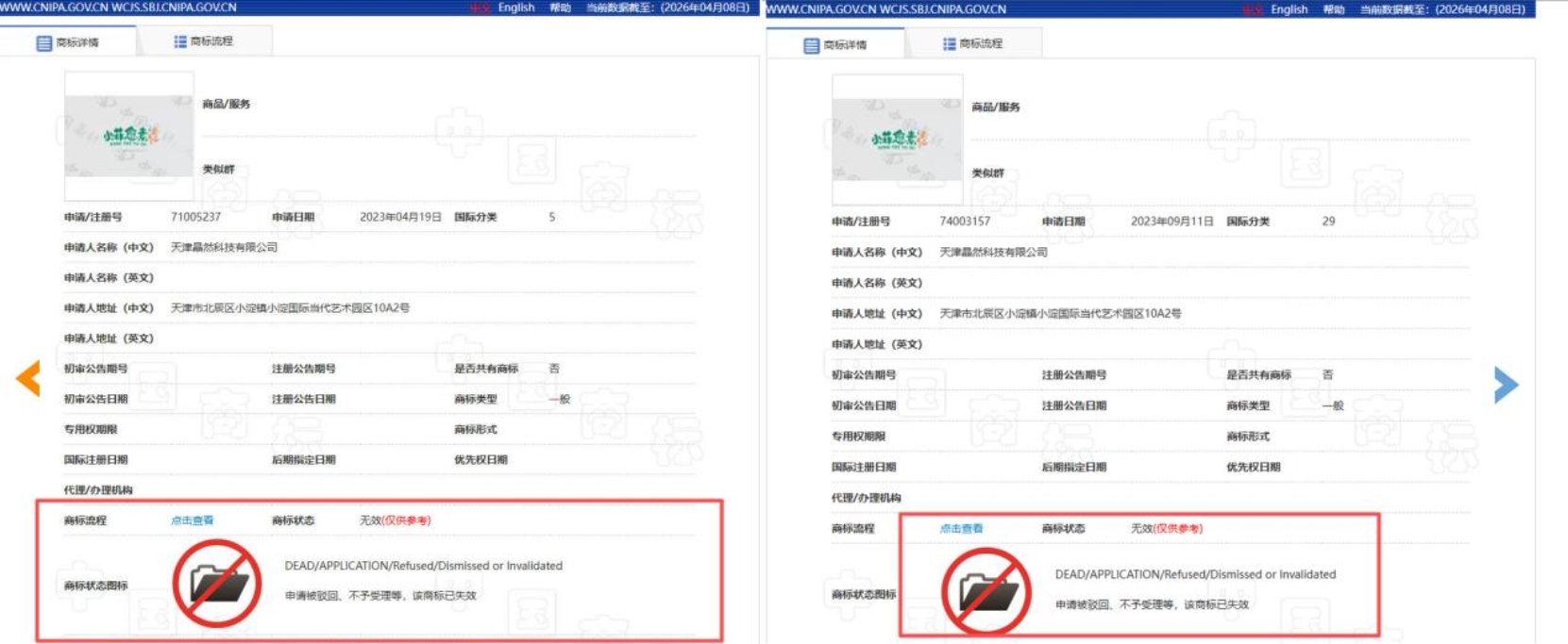 值得注意的是,查看于女士提供的产品外包装照片后记者发现,该产品由天津晶然科技有限公司(下称:天津晶然公司)委托济南厚道人生物科技有限公司临清分公司(下称:济南厚道人生物公司)生产。进一步核查国家知识产权局商标局旗下中国商标网发现,天津晶然公司分别于2023年04月19日、2023年09月11日两次提交“小菲愈素”的商标申请均被驳回,“小菲愈素”商标未获核准注册且申请被驳回。