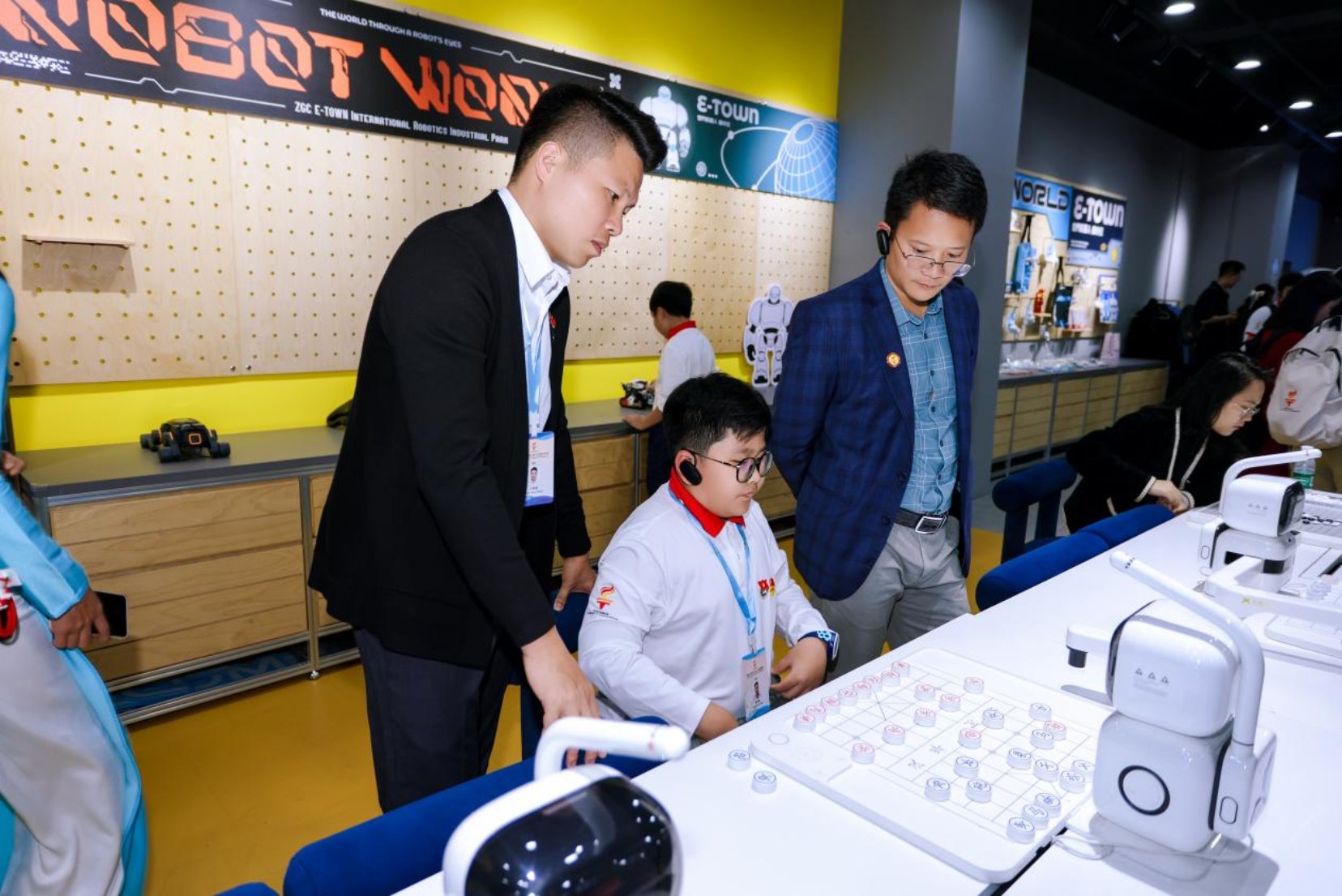 越南青年来华“红色研学之旅”之“不忘初心”研学营少先队分团走进北京亦庄机器人大世界,图为越南少先队员哈黄勇(中)体验与“AI下棋机器人”对弈。(主办方供图)