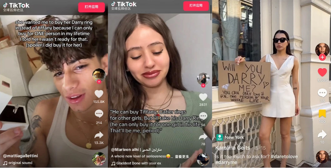 这份共鸣,早已席卷全球。作为全球主流的短视频阵地,TikTok2024年的热搜榜单上出现了DR的身影——它是当时唯一以品牌名称直接登榜的珠宝品牌,其海外热度可见一斑。不仅海外明星红人,如美国真人秀明星Emily、@Francesca Farago、Tiktok网络红人@jcandsondraa等,纷纷以DR见证爱情,年轻群体中更是掀起了一阵“不爱Tiffany爱DR”的风潮。这一趋势甚至延伸至线下,融入街头文化中,“Do you marry me”一度被“Do you darry me”替代 。至此,“DR”超越单纯品牌范畴,演变为代表着唯一、承诺与坚定选择的文化符号,成为欧美年轻一代对爱情最高愿景的具象表达。