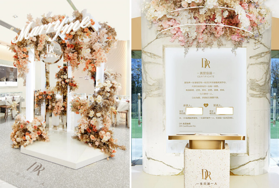 这一点,从DR真爱体验店的设计逻辑便能看出。相比用更多地方展示珠宝作品,DR更愿意将零售空间转化为一个沉浸式感知真爱的场域。在这里,每位用户都能完成专属的求婚仪式:推出载着爱情信物的DR花车,为爱人带来第一重惊喜,随后与她步入鲜花簇拥的求婚亭许下誓言,再到真爱协议墙上郑重留下彼此姓名。与此同时,DR真爱屏同步点亮两人的故事影像,将此刻定格为独一无二的永恒回忆。正因如此,无数动人的爱情时刻,才得以在DR真爱体验店真实而浪漫地发生。