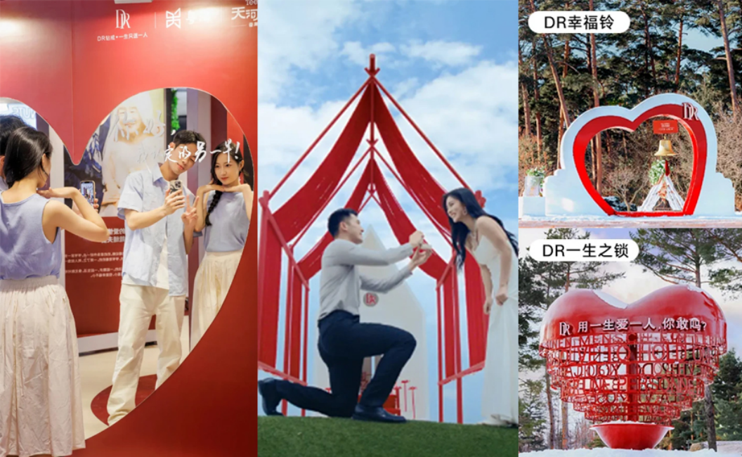 不止于门店,DR也将“爱之体验”延伸至几乎每一场线下活动:2025年初,DR联合长白山为用户搭建「1314真爱之路」 ,眷侣们可以于起点敲响DR幸福铃,到尽头“DR一生之锁”装置落下镌刻两人姓名的真爱锁,在“同淋雪,共白头”的浪漫中坚定爱意;2024年七夕,DR广州钻石婚夫妻影像展中, 特设真爱互动区,眷侣们可以在“真爱之镜”合影,并在“告白区”留下真挚爱语;2023年七夕,DR于云南大理云想山搭建悬崖礼堂 ,礼堂中设置仅能容纳两人的「爱的对话空间」,让情侣们在静谧一隅,聆听彼此的心声......相比直白地“教人如何去爱”,DR选择提供空间,让每对爱侣在亲身体验中,爱意自然升温。