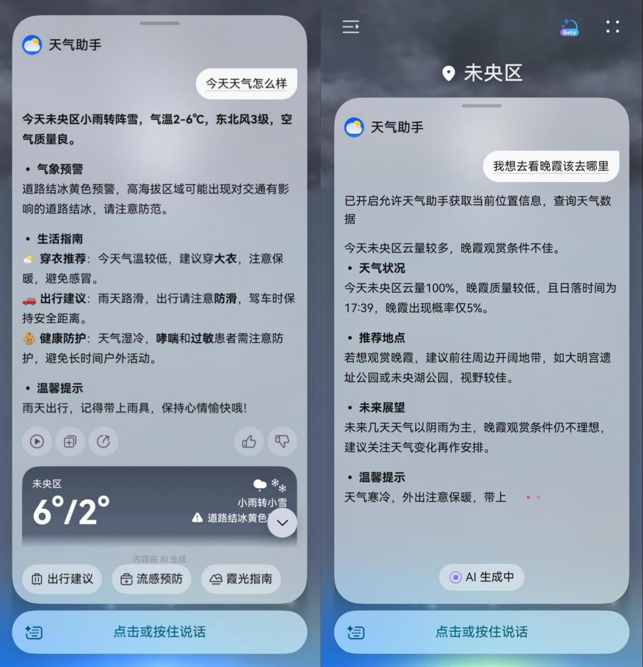 你是不是也这样:去户外跑步or骑车的时候总担心天气突然变化自己被“困”在路上。现在不用愁了,因为你的强来了!升级鸿蒙6后,新带来的系统级天气智能体服务简直全能,不仅能问“明天天气怎么样”;想看晚霞、看星星也能问它“我想看晚霞该去哪里”;想要运动也能提前问一问“今天是否适合钓鱼?户外跑户?运动骑行?”它不仅会给出答案和建议,也会附带提醒和防护信息,可以说是相当贴心。