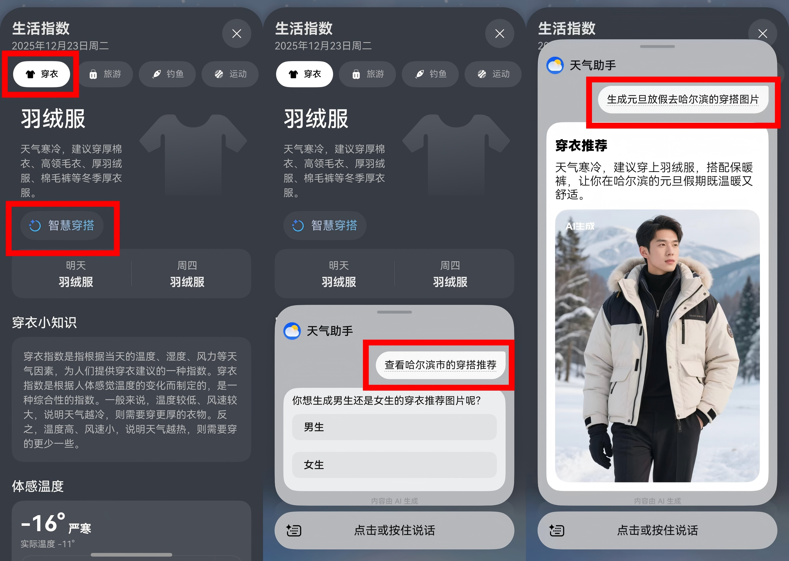 最让我惊喜的“超能力”,莫过于华为天气帮我搞定了每日终极难题——今天到底穿什么?进入华为天气-穿衣卡片,找到“智慧穿搭”就能用,无论是聚会、通勤,还是外出旅行,只要你对它说“生成元旦放假去哈尔滨的穿搭图片”,它就能为你生成贴合场景的参考,而且不只是“温度+建议”的枯燥文字,而是直观的穿搭灵感图,这也太绝了。