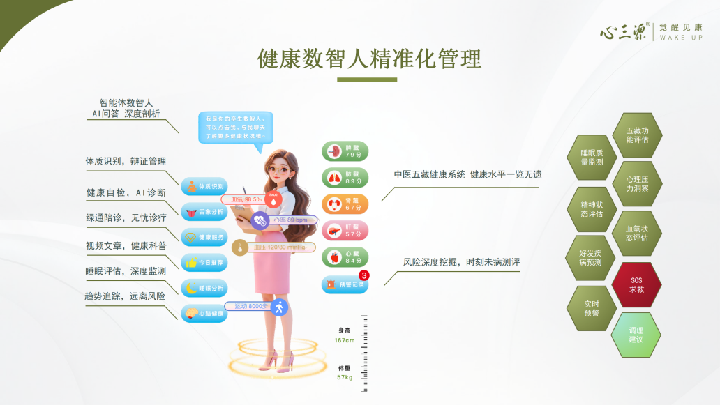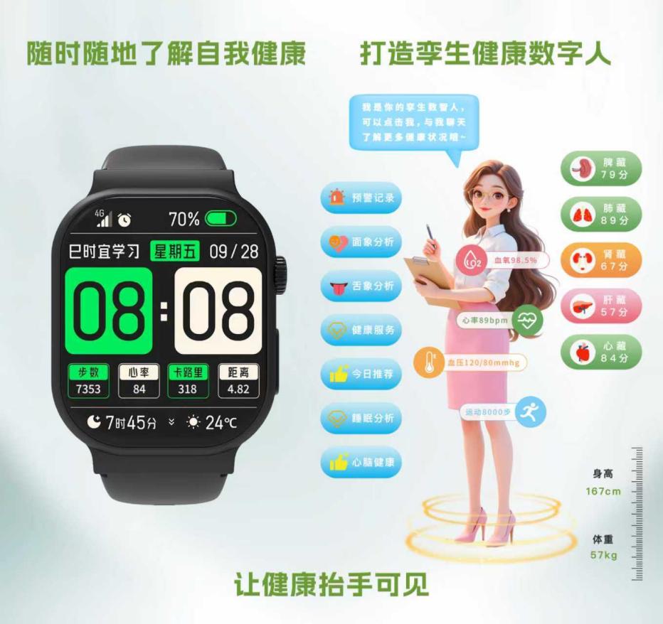 2026年1月1日,心三源®健康监测手表迎来重要功能更新——全新的“AI健康数智人”正式与用户见面。这不仅仅是一次功能升级,更是您个人健康管理的专属智能伙伴。它深度整合手表7×24小时监测的14项核心体征数据与中国中医科学院的临床研究精华,以“数字孪生”的形式,为您提供全天候、个性化的健康解读与服务,让专业的健康管理变得简单、贴心。