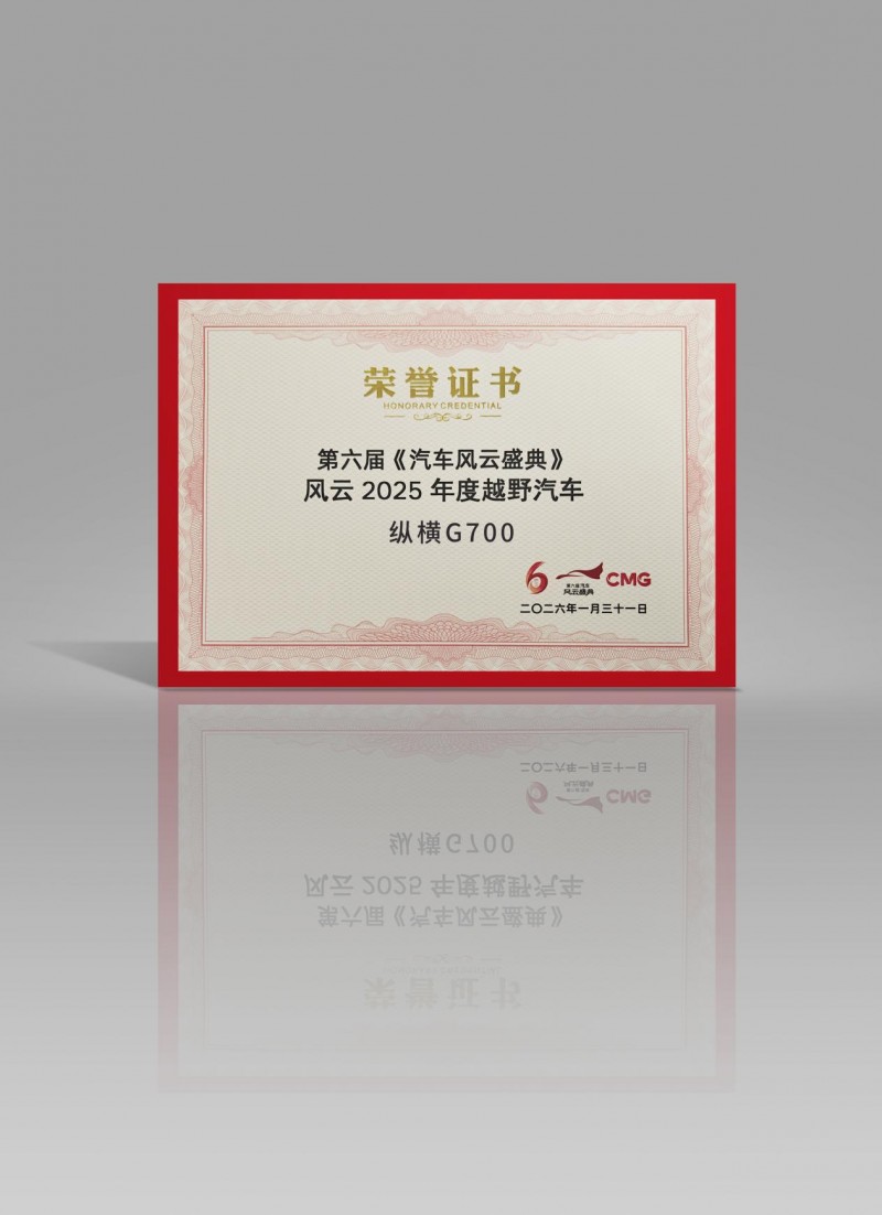 2026年2月15日,由中央广播电视总台主办、总台财经节目中心特别策划的第六届《汽车风云盛典》正式揭晓年度重磅奖项。纵横G700凭借“陆、海、空、智、享、尊”六维硬核实力,从众多参选车型中脱颖而出,成功斩获“风云2025年度越野汽车”殊荣。