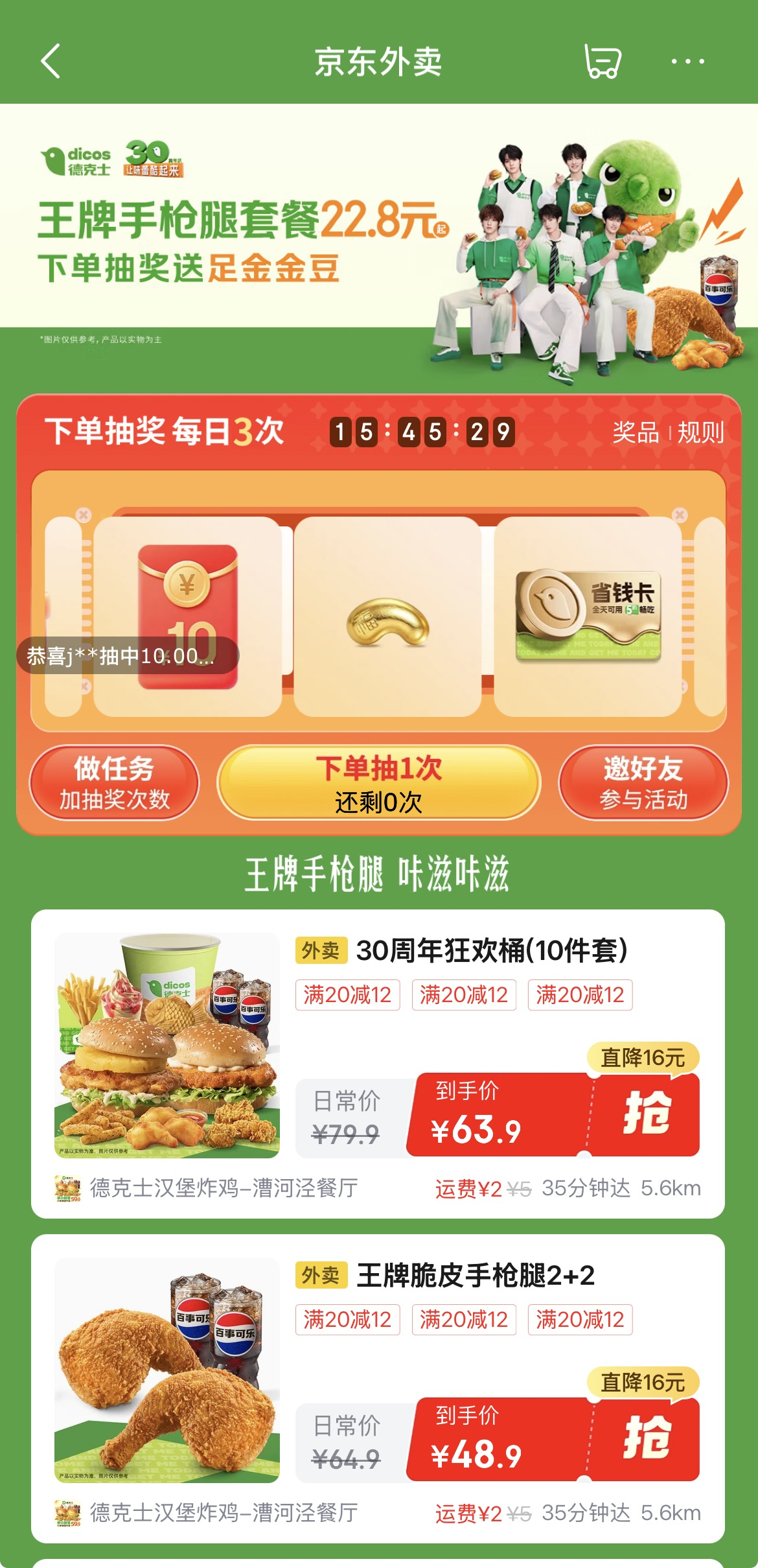 活动期间,用户在京东和京东外卖APP,在秒送频道搜索“德克士30周年庆”进入活动会场,下单即可参与抽奖,大奖送出5枚1g足金金豆,更有机会赢取德克士尊享年卡(价值128元)及30周年专属优惠券,全方位承包消费者的“吃鸡自由”。