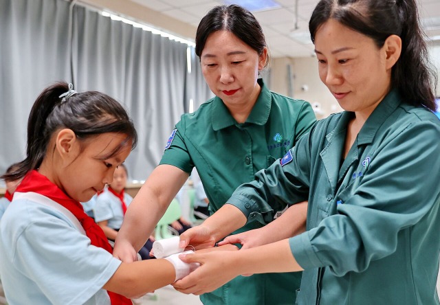 医护人员为学生普及应急包扎相关知识。通讯员 曹建雄 摄