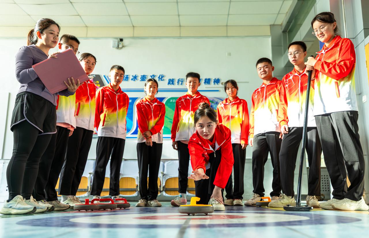 在甘肃省张掖市第一中学,学生们正在老师指导下练习旱地冰壶。通讯员 杨潇 摄