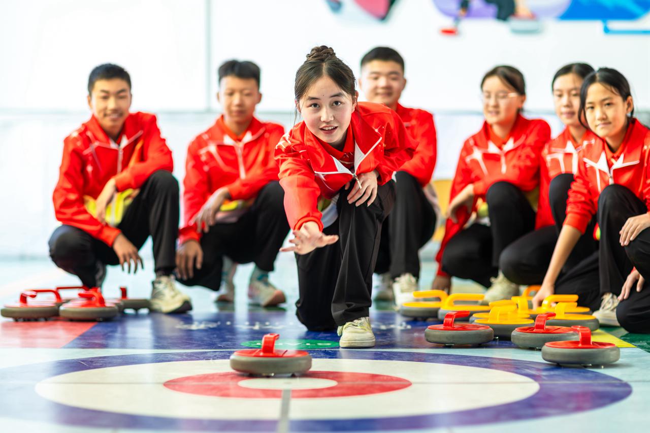 在甘肃省张掖市第一中学,学生们正在练习旱地冰壶。通讯员 杨潇 摄