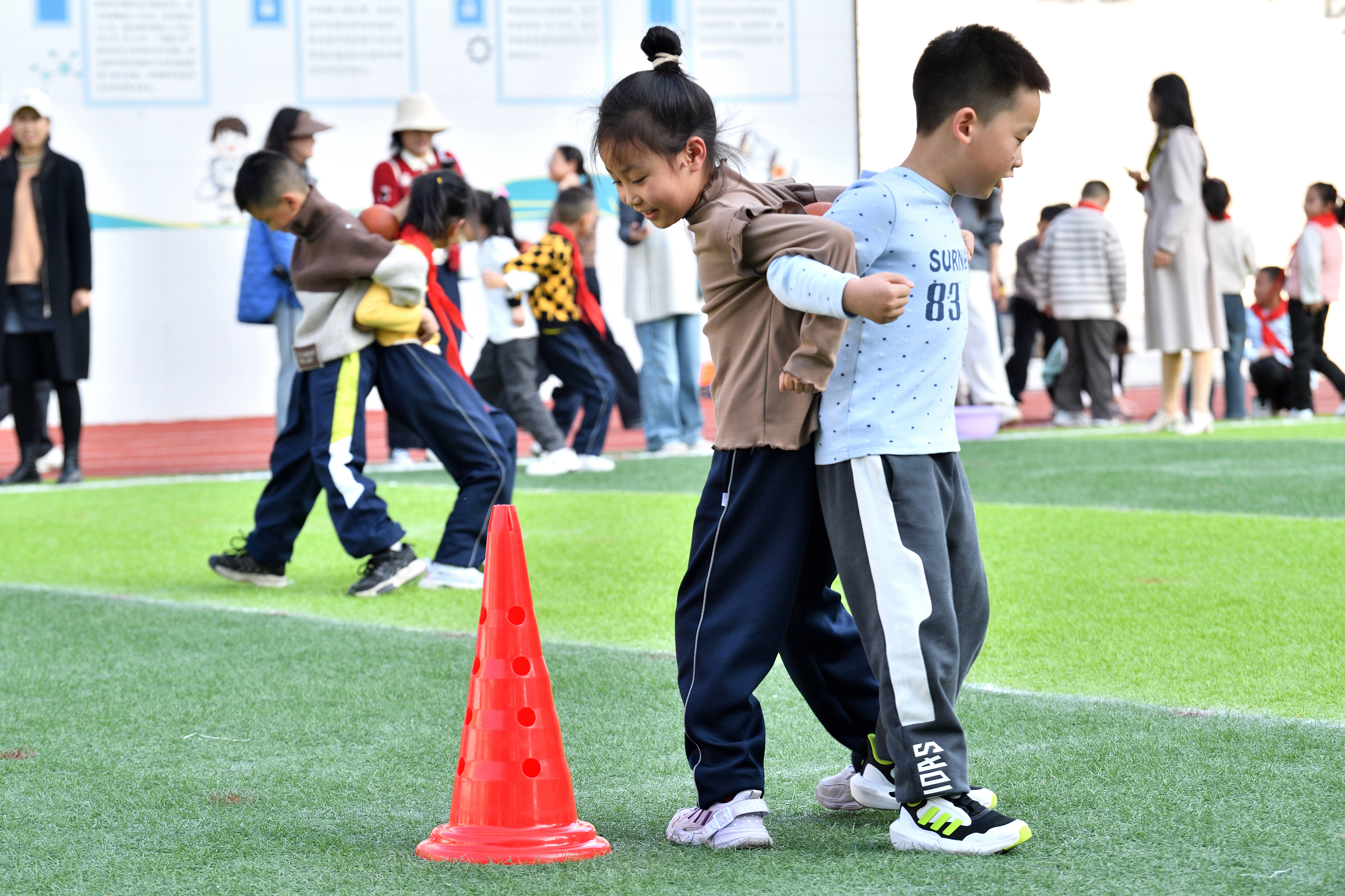 11月14日,湖北省襄阳市保康县实验小学举办为期两天的体育节,打造了一场集体育竞技、劳动实践与跨学科融合于一体的校园盛会,让师生充分享受体育运动带来的乐趣。活动旨在全面落实学生每天锻炼一小时的健身行动计划,践行“每一个都精彩”办学理念,丰富校园文化生活,推进阳光体育运动,增强学生身体素质,促进学生全面发展,培养学生集体荣誉感和班级凝聚力。(中国教育报-中国教育新闻网通讯员 杨韬 黄丽 摄)