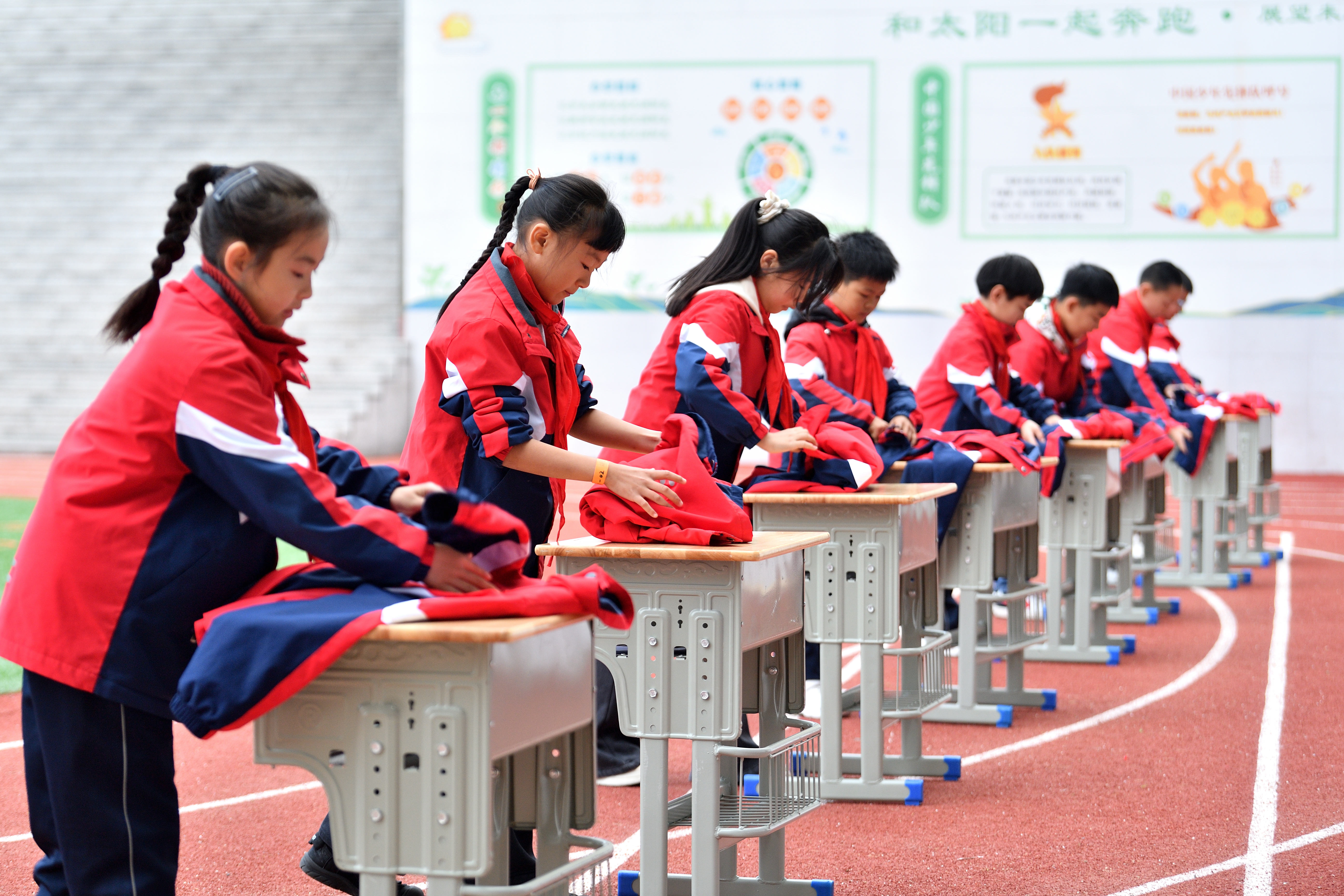 11月14日,在湖北省襄阳市保康县实验小学,学生们在体育节上参加“翻山越岭叠衣服”比赛。杨韬 黄丽 摄