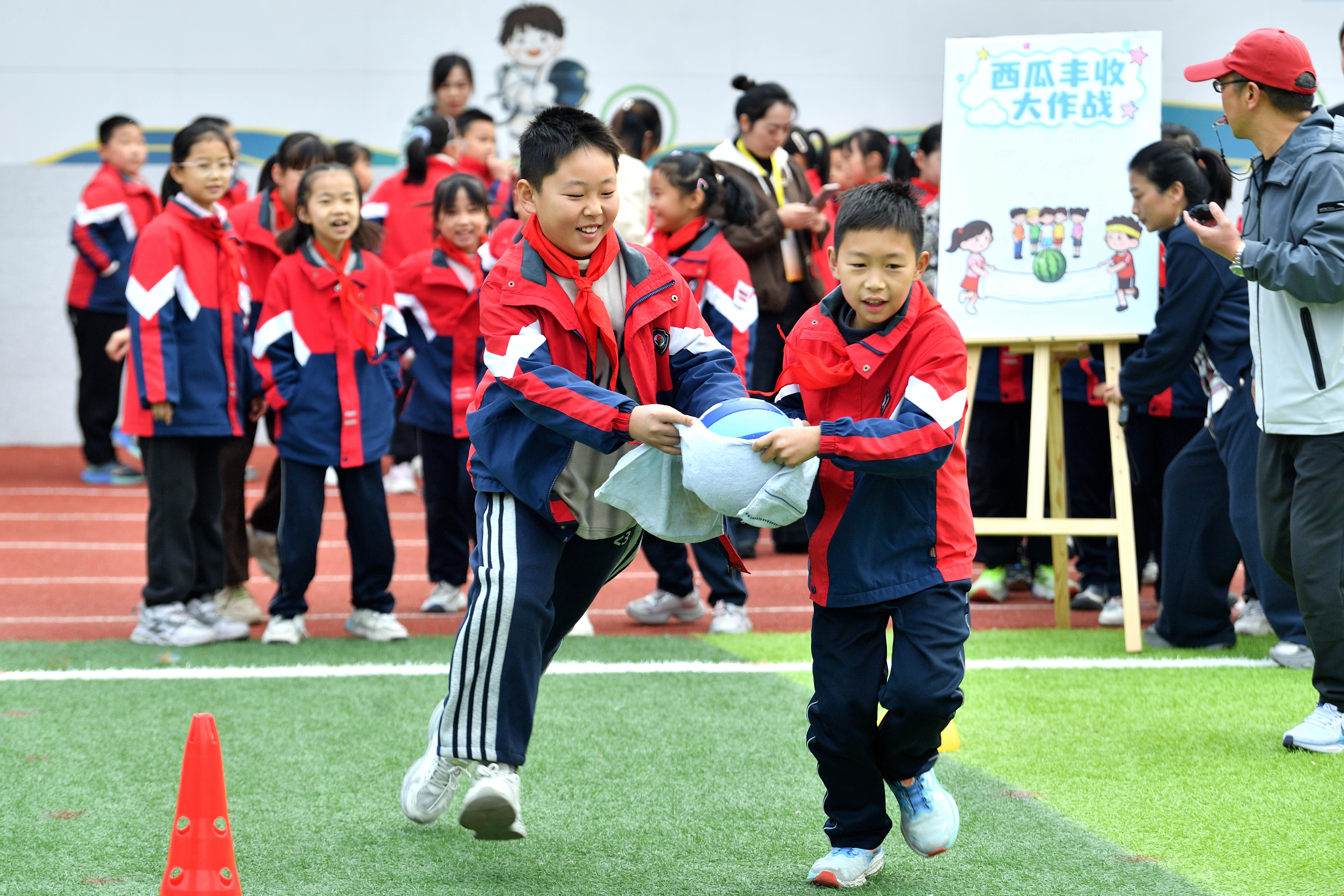 11月14日,在湖北省襄阳市保康县实验小学,学生们在体育节上参加“西瓜丰收大作战”比赛。杨韬 黄丽 摄