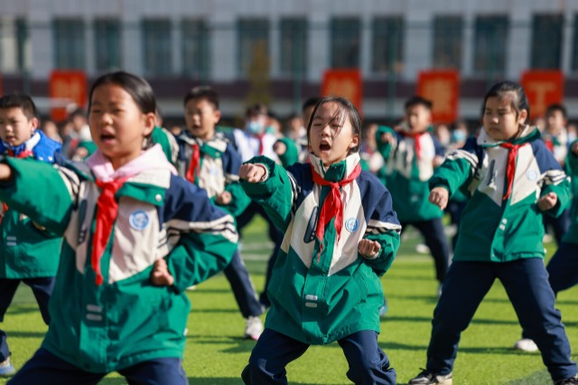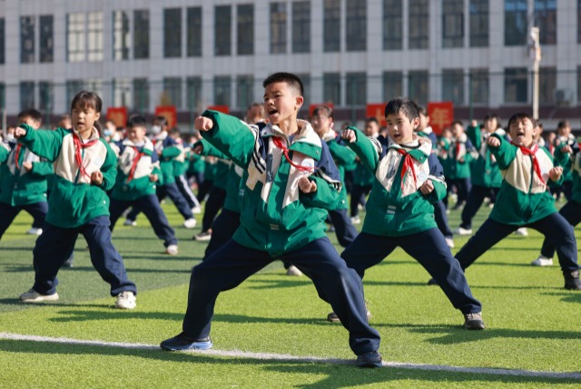 学生在大课间练习传统武术。通讯员 胡攀学 摄