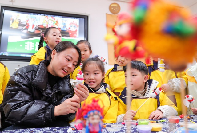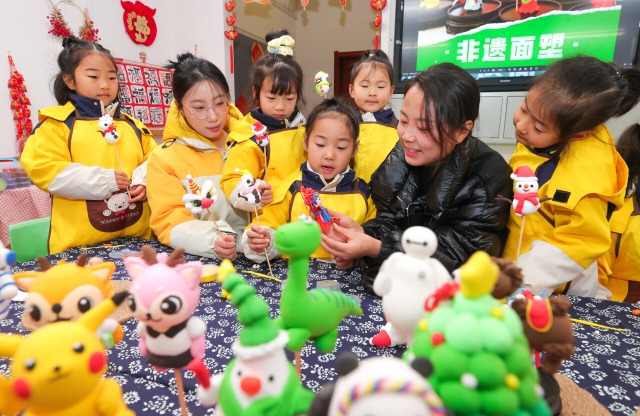 12月24日,安徽省淮北市第一幼儿园华佳梅苑分园邀请商派面塑非遗传承人王艳现场展出小面人及饰品面塑作品,为孩子们讲解面塑制作方法,让孩子们零距离感受指尖非遗魅力。中国教育报-中国教育新闻网通讯员 冯树风 摄