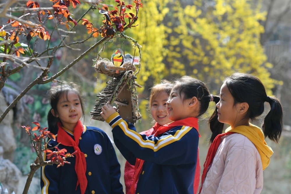在山东省青岛市市北区宜阳路小学开展的爱鸟护鸟主题活动上,学生们在为小鸟悬挂“新家”。通讯员 王海滨 摄