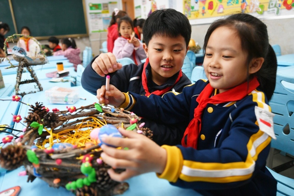 在山东省青岛市市北区宜阳路小学开展的爱鸟护鸟主题活动上,学生们在为小鸟制作鸟巢。通讯员 王海滨 摄