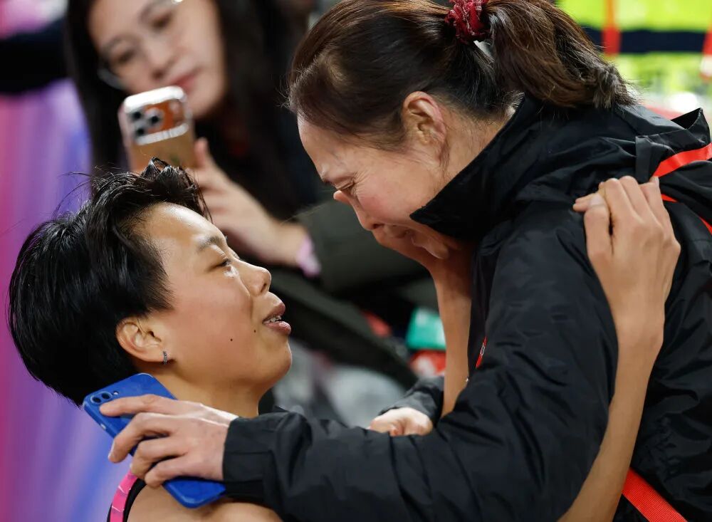 计时器定格在12秒81,夺冠,创造个人最好成绩。她跑向看台,与妈妈相拥,轻抚妈妈的脸庞,为她拭去激动的泪水。