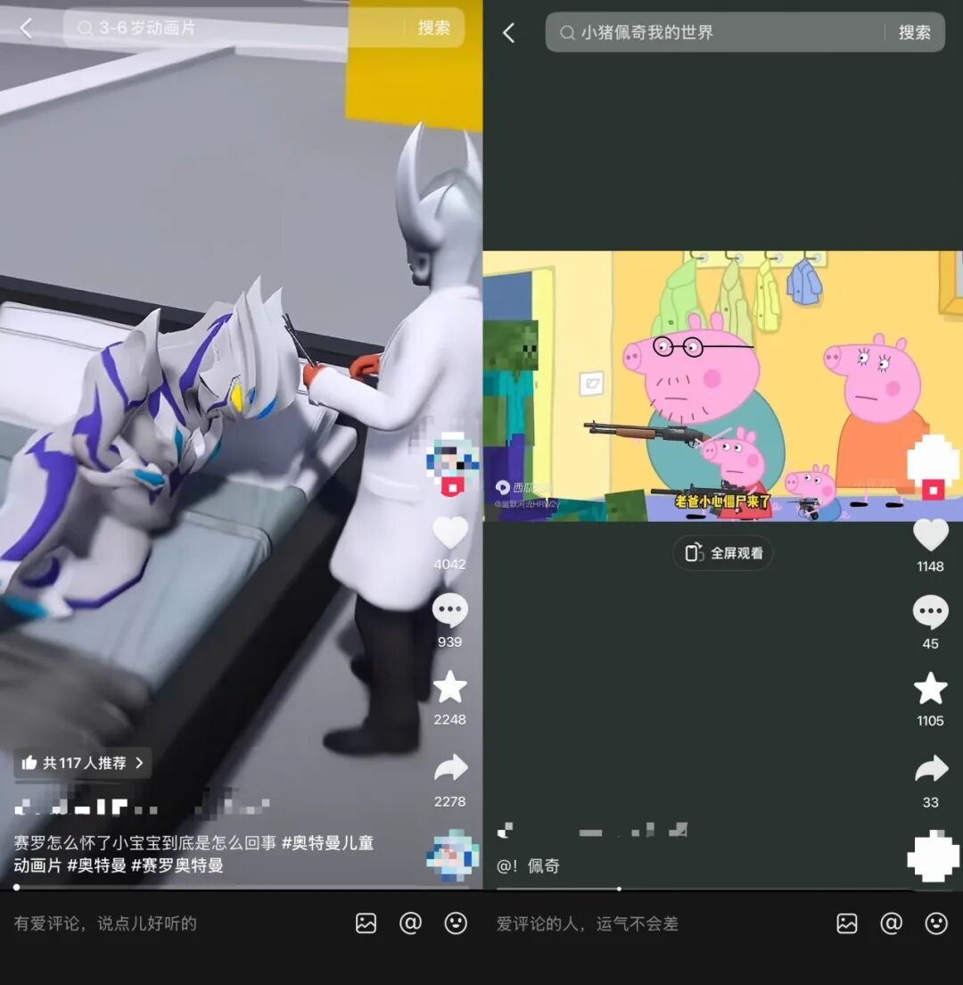 “奥特曼怀孕”、“小猪佩奇打僵尸”视频内容截图
