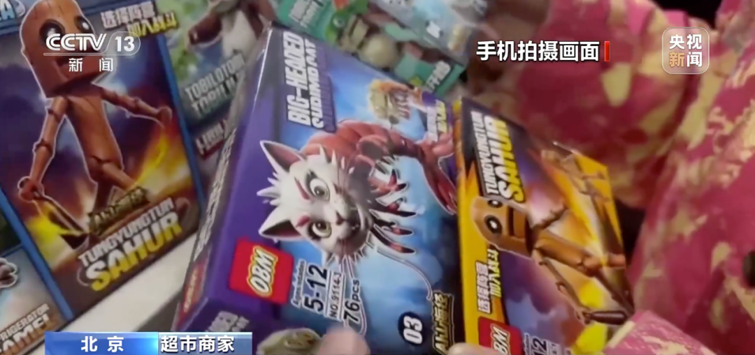 这一传播已经不止于网络中。记者调查发现,在一些主流网购平台上,搜索“外国山海经”会自动关联出大量相关词条。除了以这些AI动画形象为原型制作的玩具、手办外,还有文具、漫画书、生活用品等等,不少商品页面显示“已售10万+”。一些学校周边的文具店、超市、玩具店,也有“外国山海经”相关玩具在售。
