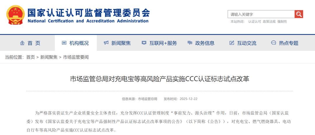 2025年11月,国家市场监管总局(国家认监委)发布相关公告,对充电宝、燃气燃烧器具、电动自行车等共计3类11种高风险产品实施CCC认证标志试点改革。