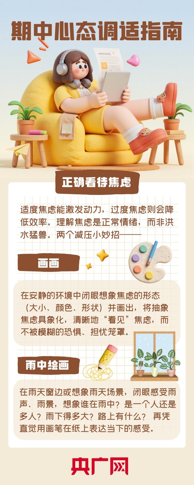 光阴似箭,转眼间就到期中了,对于马上就要到来的期中考试,你是不是很紧张、很焦虑呢?别急,小编准备了一份期中心态调适指南,希望能缓解你的紧张和焦虑,从容应对接下来的考试和学习。