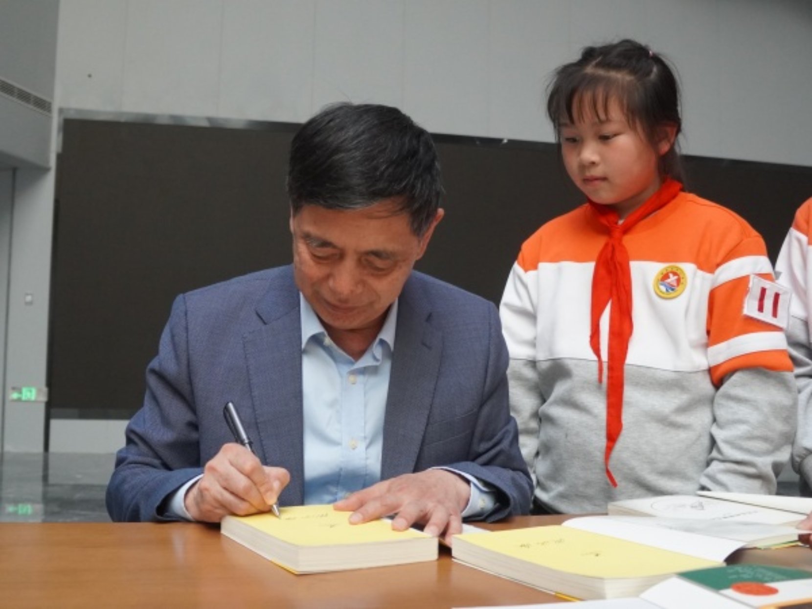 活动尾声,沈石溪老师与全体同学合影留念,还逐一为同学们带来的书籍亲笔签名,留下专属的文学印记。同学们也满怀心意,将本校学子亲手设计制作的文创杯子、校园主题明信片赠予沈老师,并结合明信片上的校园十景,生动讲解校园点滴,传递最真挚的敬意。临别之际,同学们依依不舍,纷纷热情邀请沈老师日后走进学校,与大家再续文学之缘。