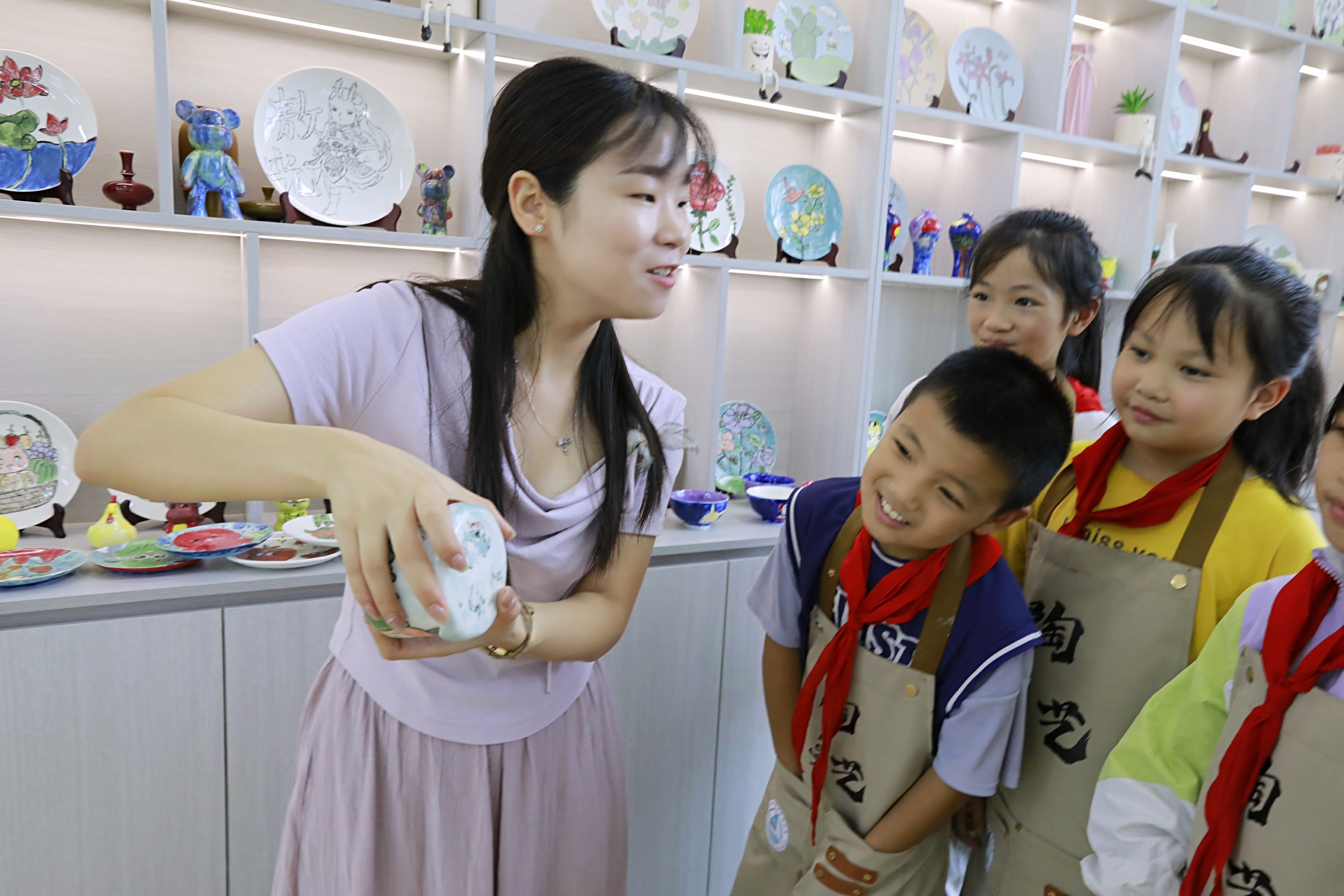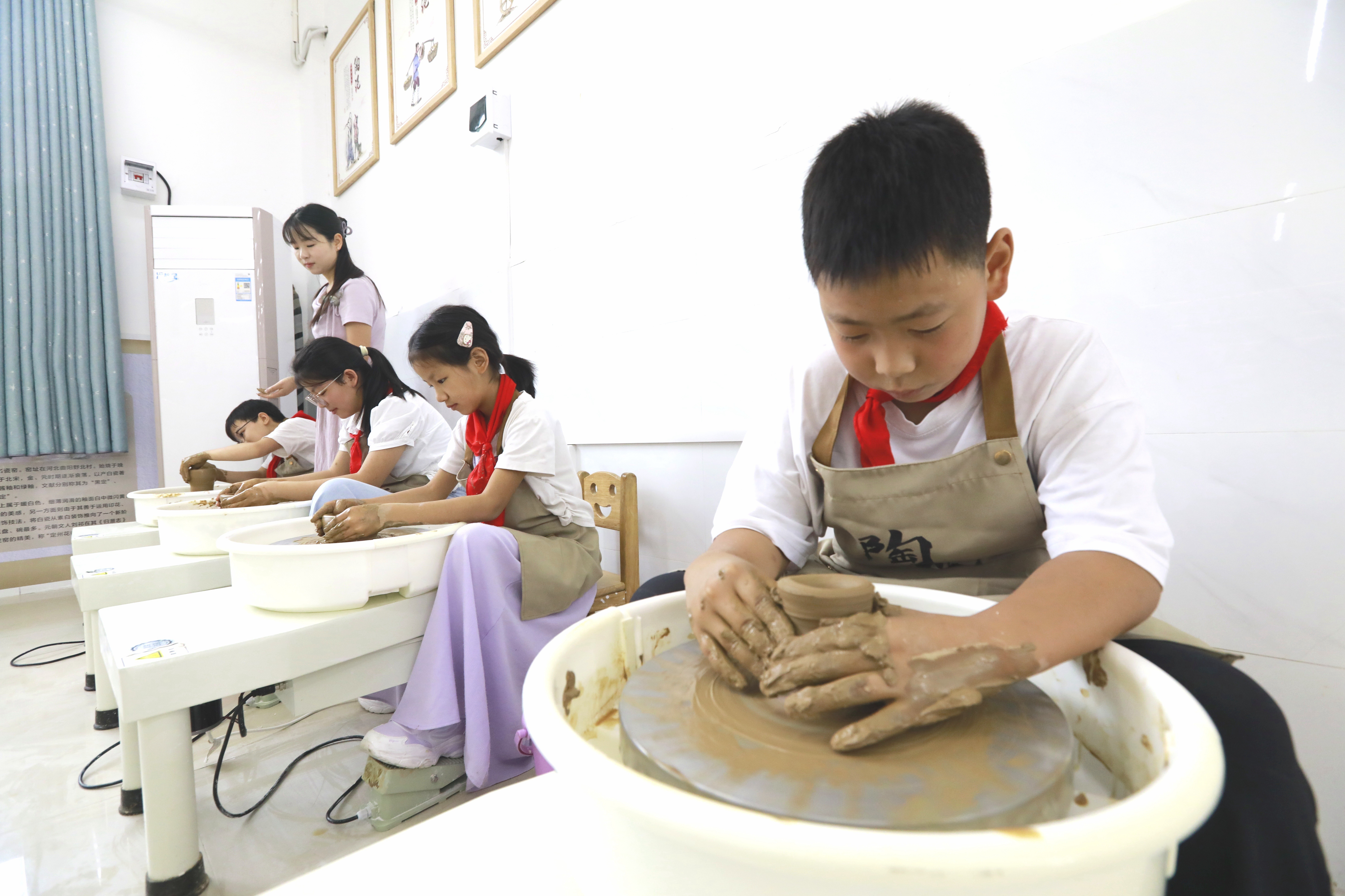 农村孩子对泥土有着天然的亲近感,学校依托这一优势,将陶艺社团作为特色社团重点打造,让“玩泥”成为培养学生创造力、动手实践的载体。从揉泥、塑形到烧制、上色,每个环节都需要耐心与细致。在“拉坯”环节,很多学生一开始无法让陶泥在拉坯机上站稳,教师会手把手教他们定中心、调力度、控转速,鼓励他们反复尝试。