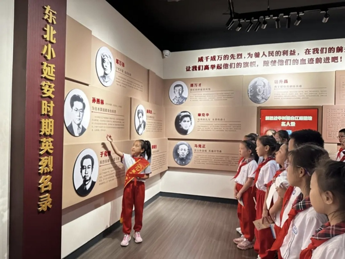 活动中,学生告别课本,置身于合江省政府旧址的真实场景中,在讲解员的引导下,循着合江省的成立背景与抗战贡献,去感受那段峥嵘岁月。纪念馆内的文物实物、历史照片成为鲜活教材,随行教师现场开展“微思政课”,红领巾宣讲员接力讲述英雄事迹,让抽象历史变得可触摸、可感知。最后,全体少先队员面向队旗庄严宣誓,在沉浸式体验中接受精神洗礼,将红色基因融入成长血脉,厚植爱国爱党信念,将活动推向高潮。