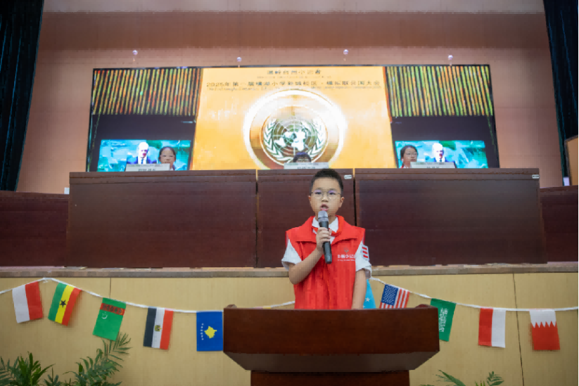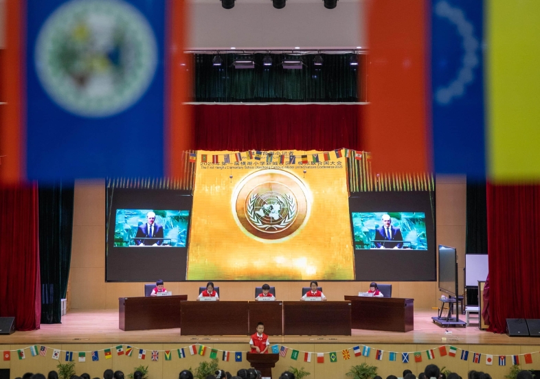 10月21日,一场别开生面的模拟联合国大会在横湖小学新城校区成功举行。活动以创新的形式将国际理解教育融入实践。小记者们化身各国代表,全程使用英语进行演讲、辩论和磋商,亲身体验多语言环境下的国际交流。会场内各国国旗庄严悬挂,营造出浓厚的国际会议氛围。