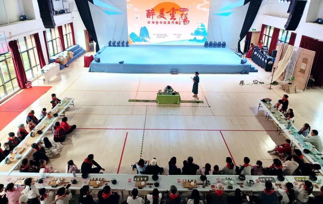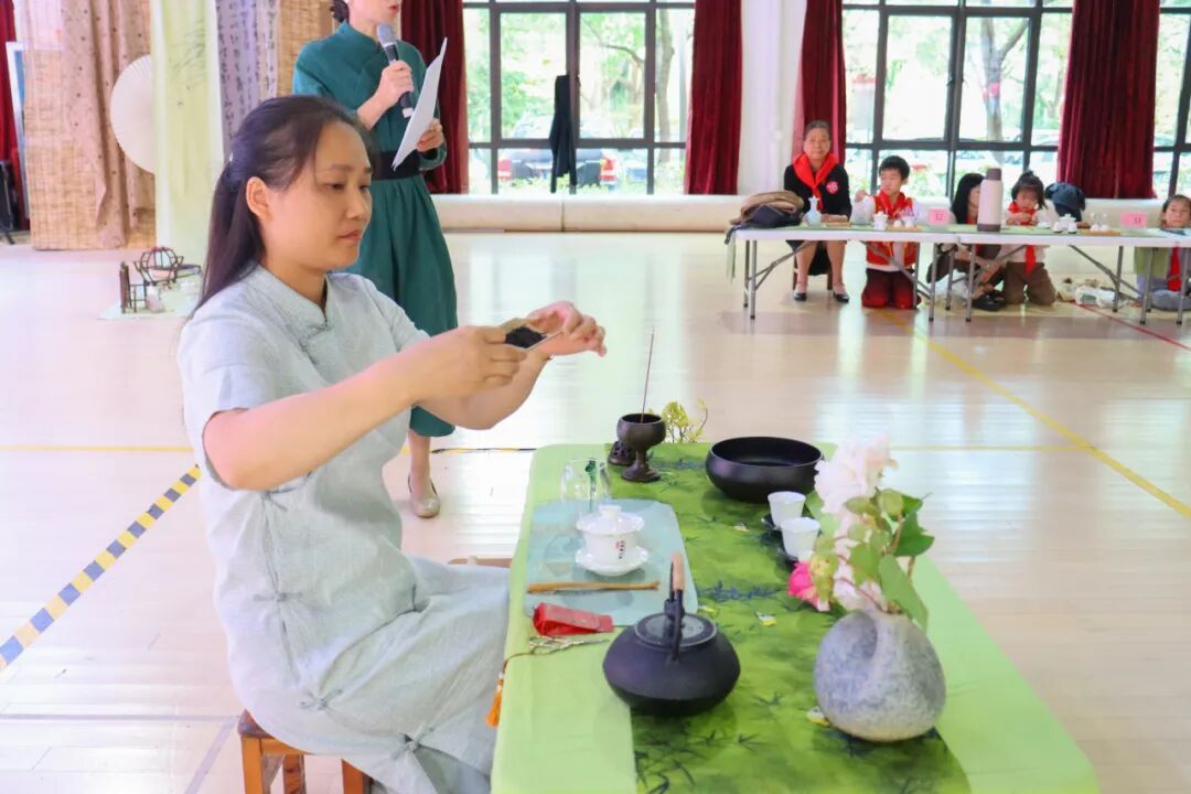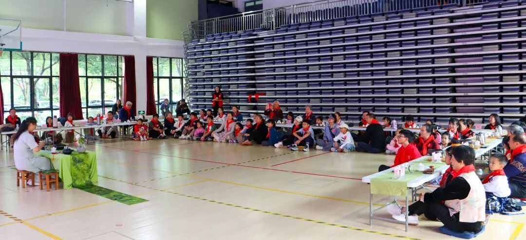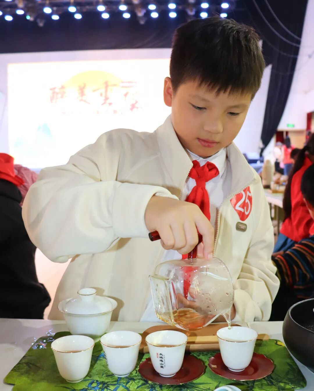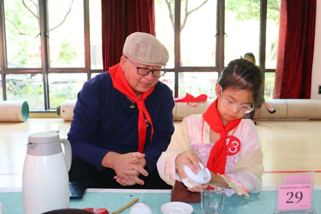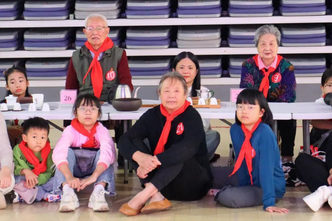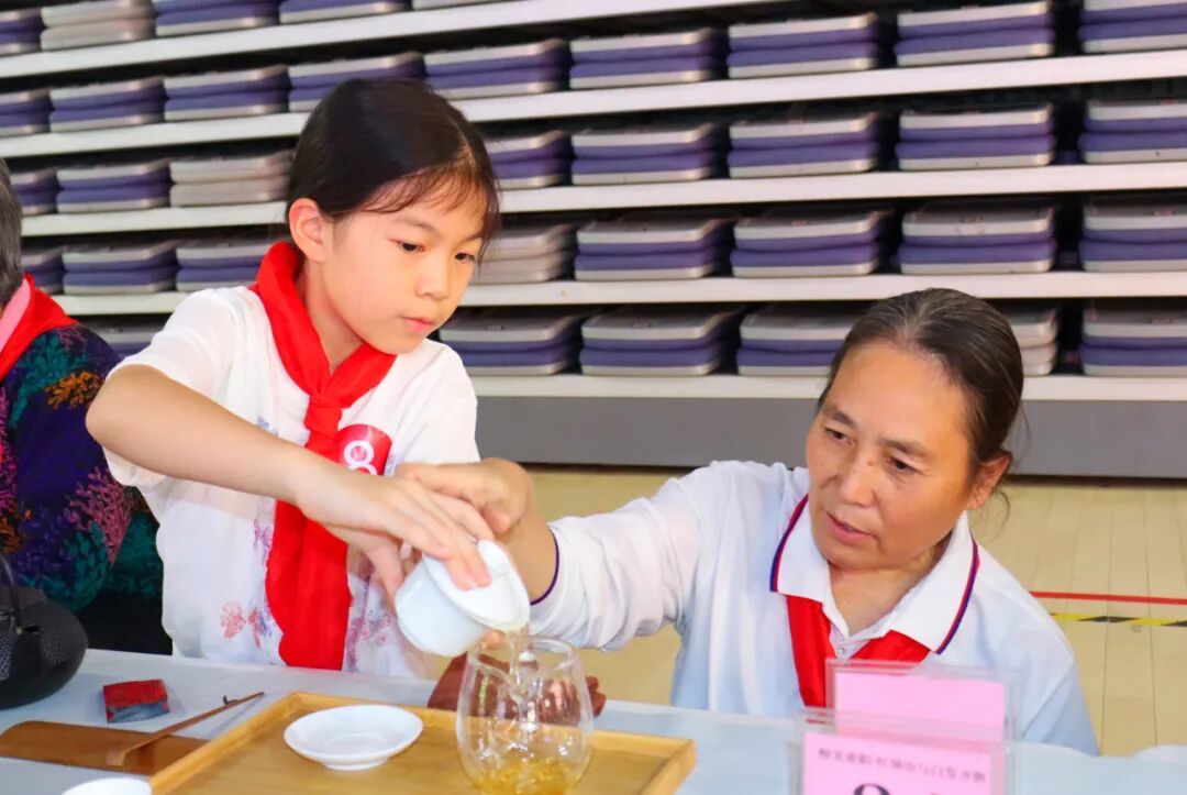 孩子们跟着茶艺老师学习泡茶,温杯、投茶、注水......大家小心翼翼地将泡好的茶递到祖辈手中。