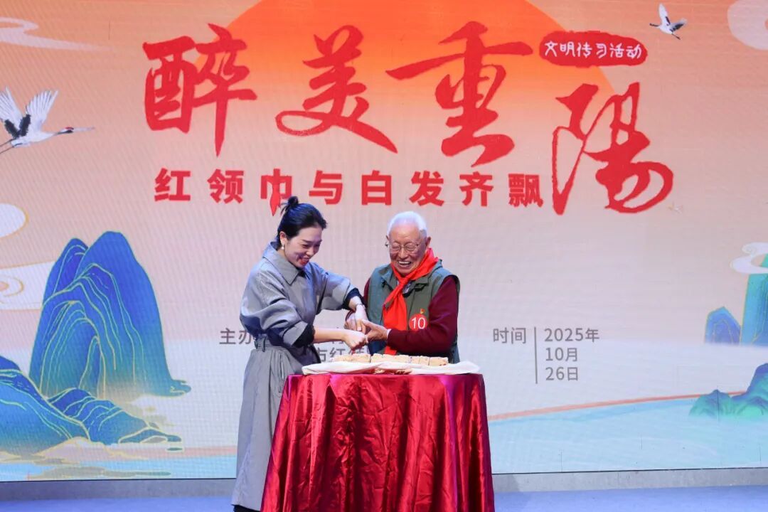 温岭市少先队终身辅导员俞明德爷爷和温岭市青少年宫副主任陈伟阿姨共同切开象征团圆长寿的重阳糕。