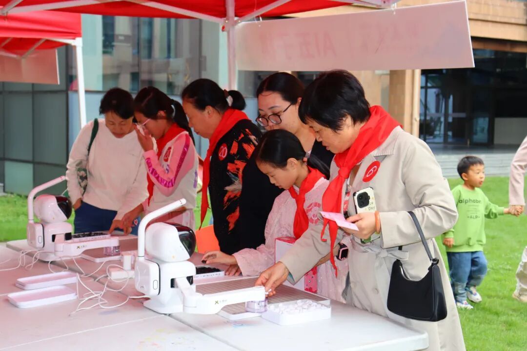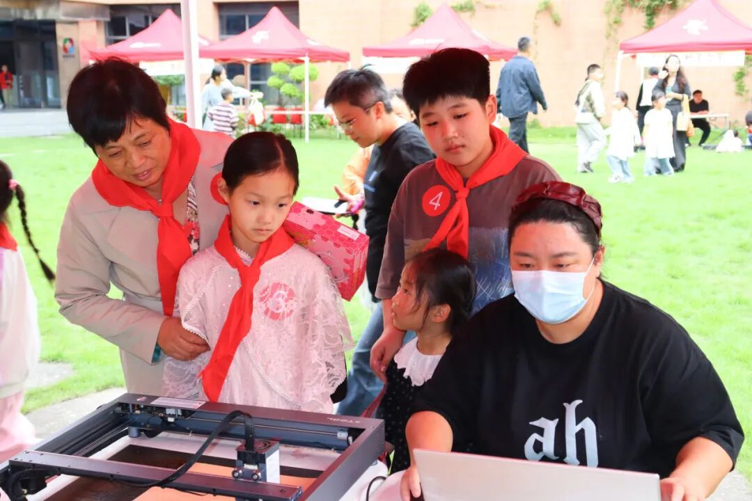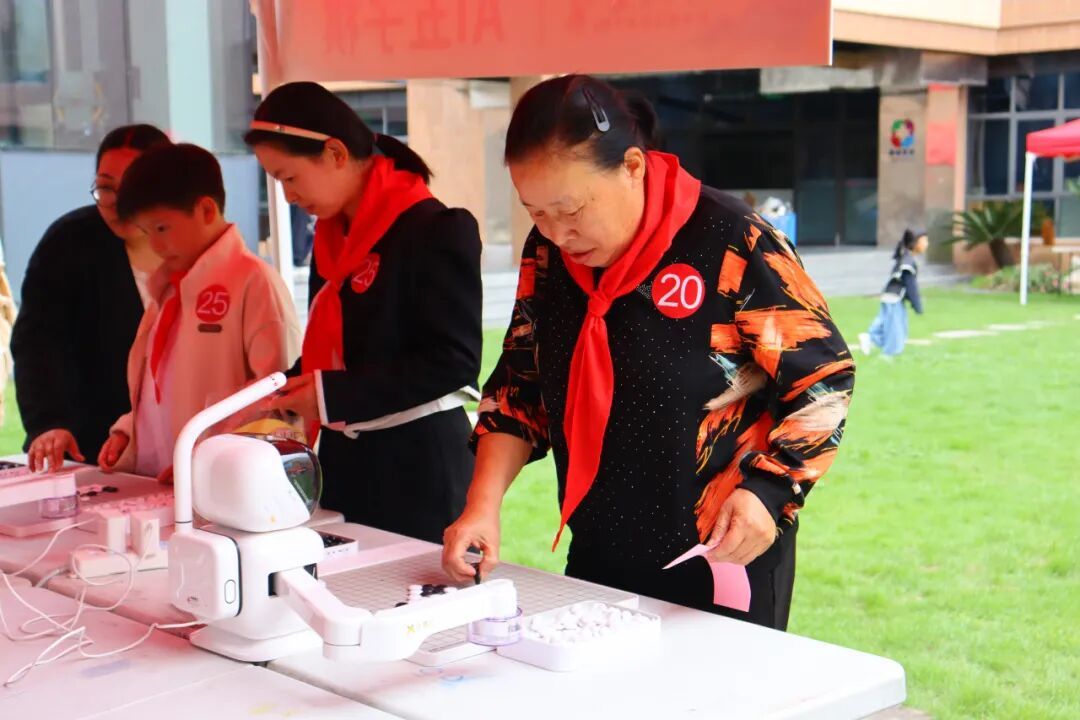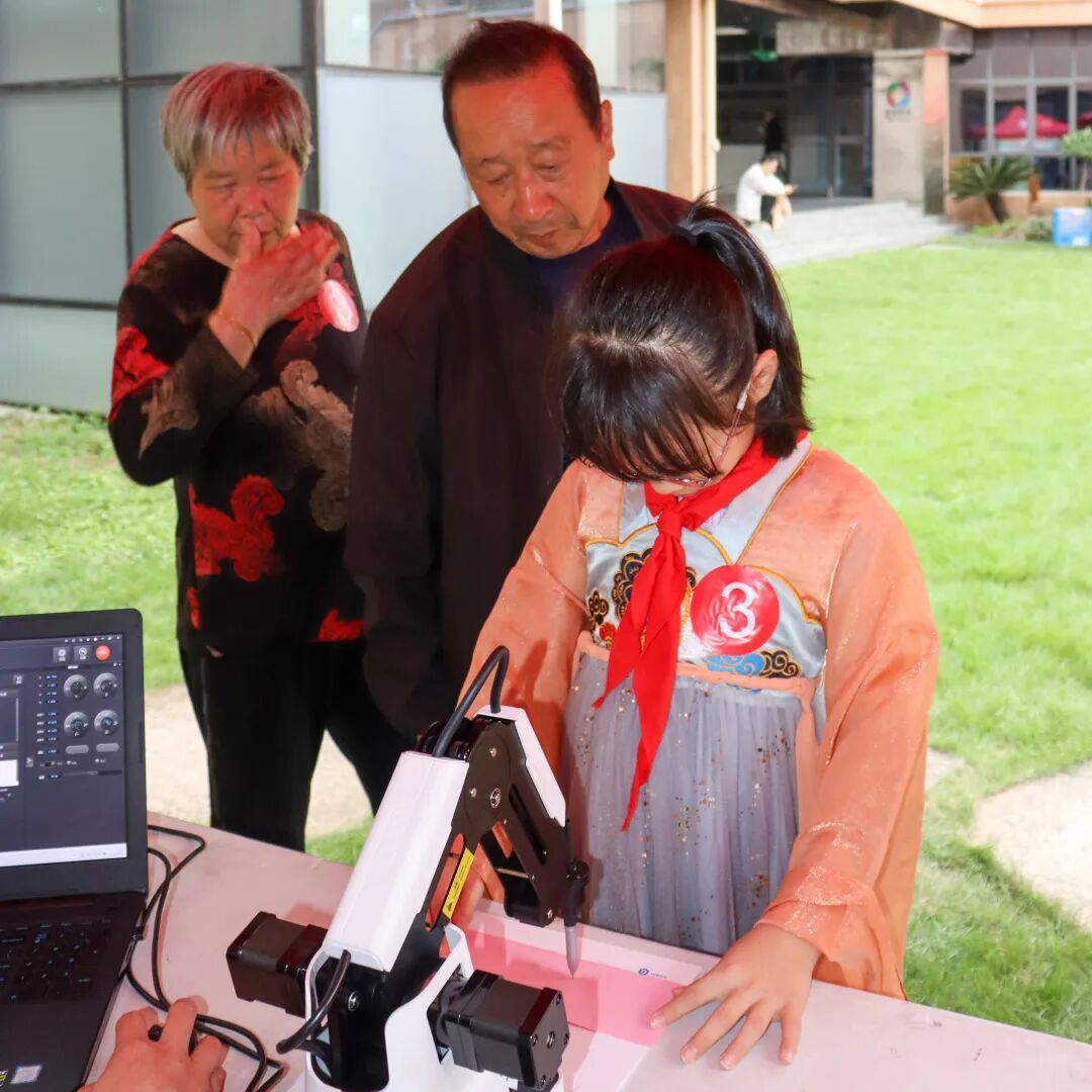 孩子们化身 “小老师”,手把手教祖辈按动按钮,看雕刻机划出花纹、机械臂书写祝福,老人们的眼睛里满是惊喜。