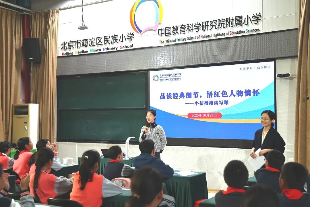为深化集团化办学优势、推动小初语文教学能力衔接,10月27日下午,海淀区民族小学特邀北京交通大学附属中学第二分校高中语文特级教师李平,在南校区敬和堂开展“品读红色经典,悟红色人物情怀”专题讲座。五、六年级主题阅读社团50余名师生参与活动,在李老师的引导下,完成了一场从“小学式感知”到“初中式深度解读”的红色文本学习之旅。