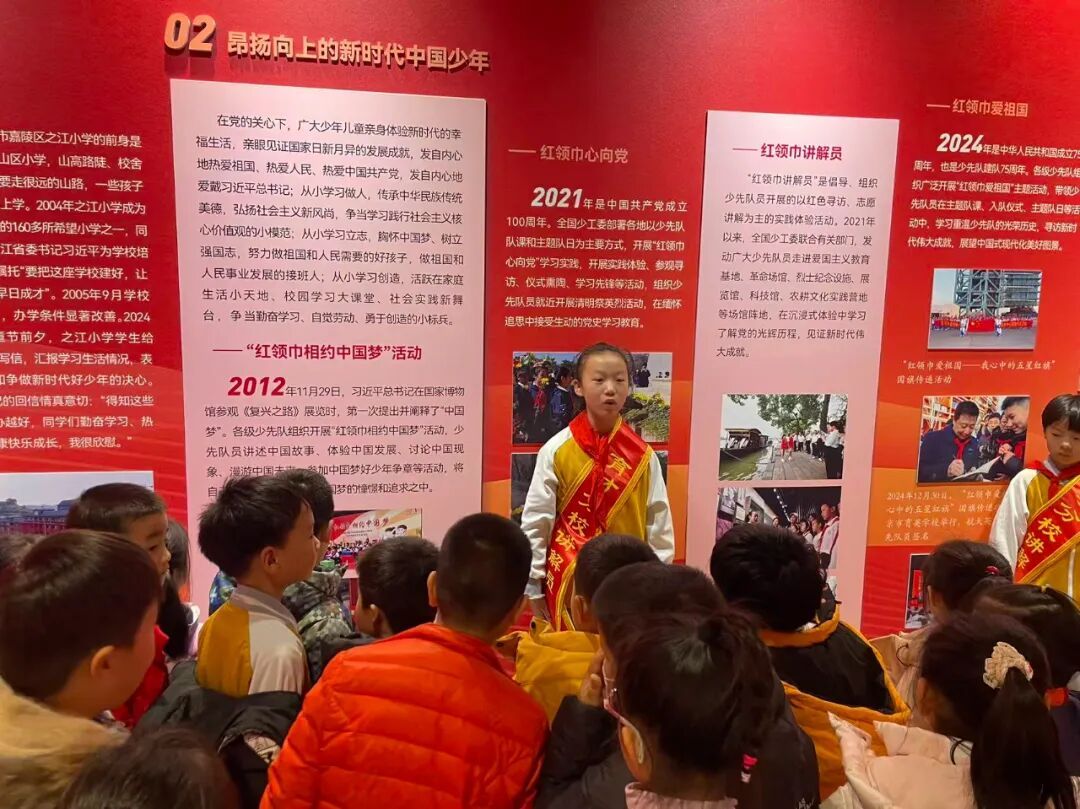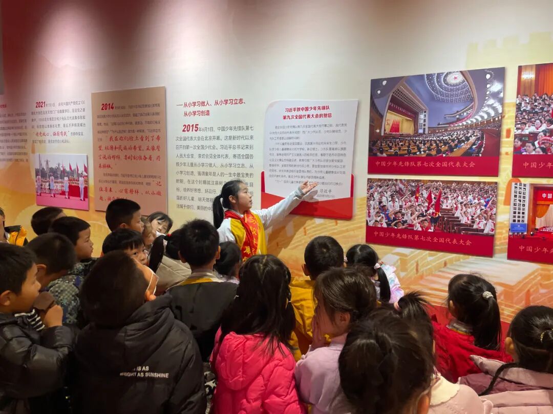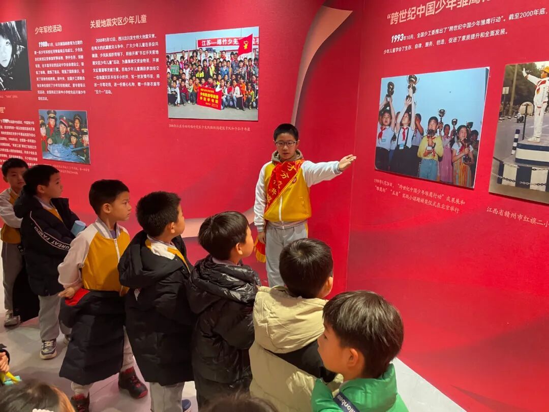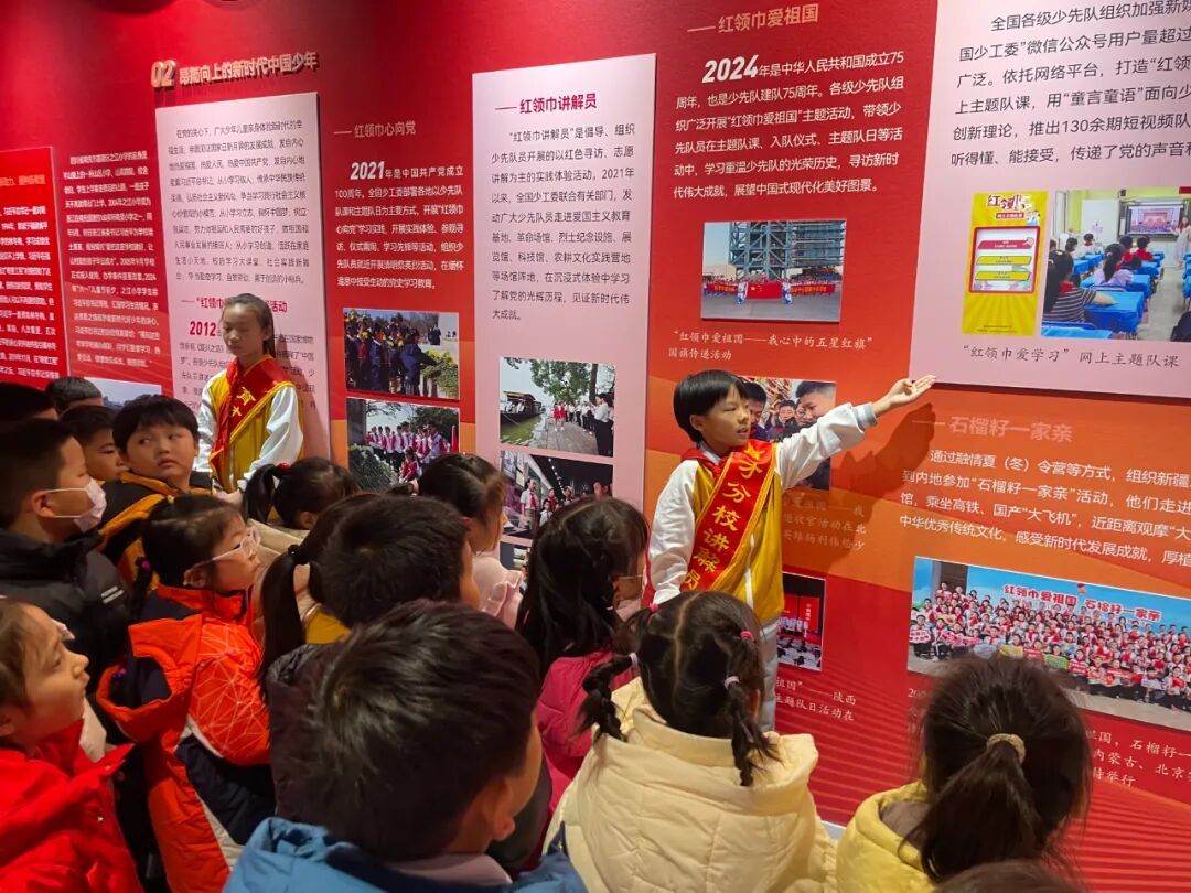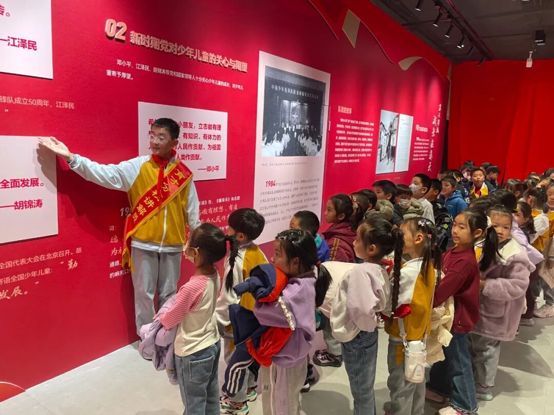 展览现场,一年级同学在班主任老师们的组织和带领下跟随小讲解员,聆听红领巾的百年历程,目光中充满向往与崇敬。此次活动不仅是一次生动的队前教育,更是一场温暖的传承接力,在讲述与聆听之间,少先队的使命与荣光深深扎根于孩子们心中。