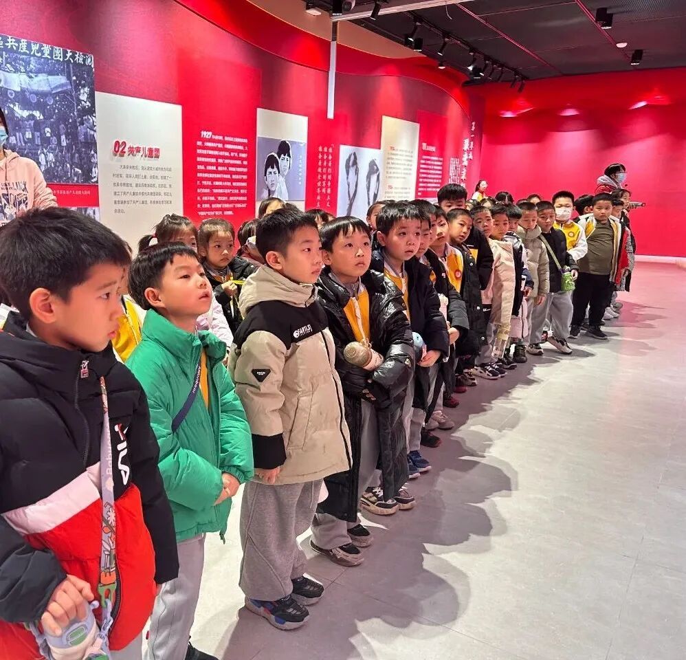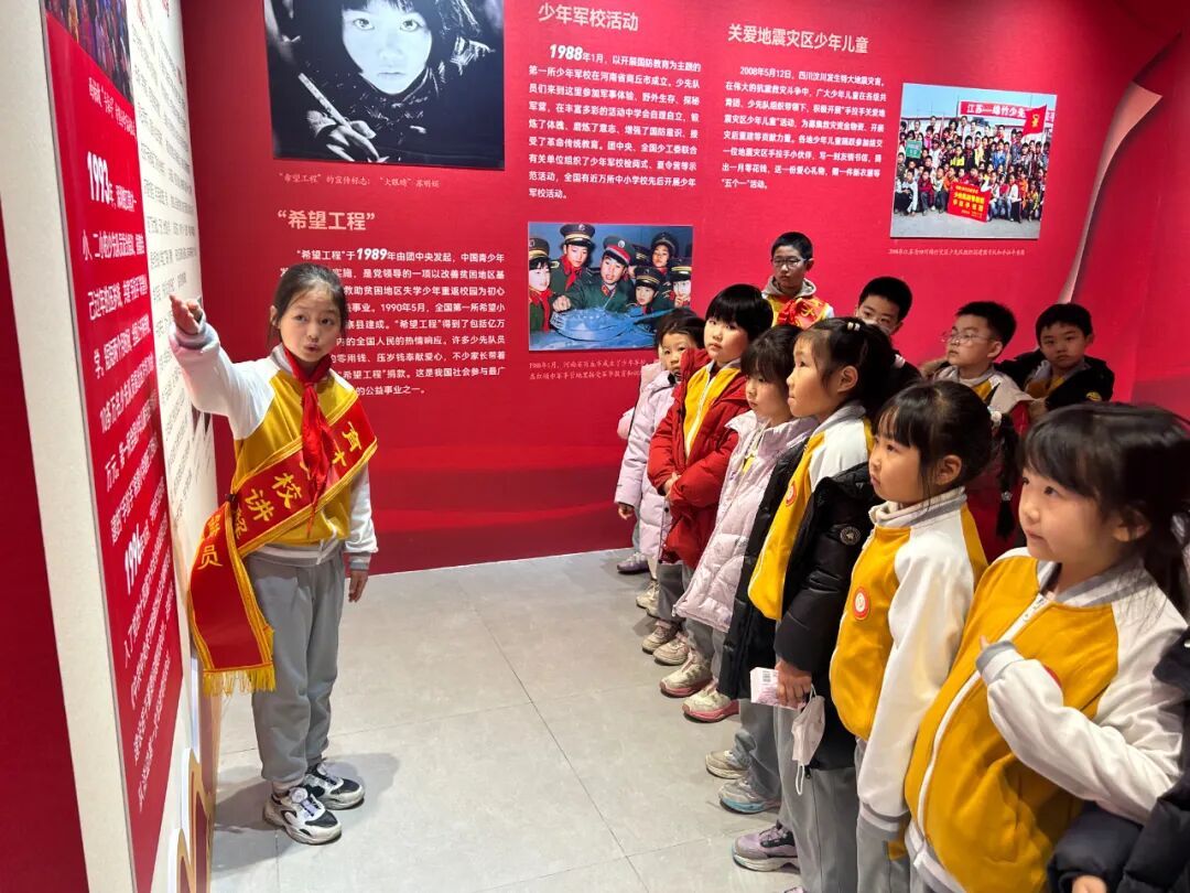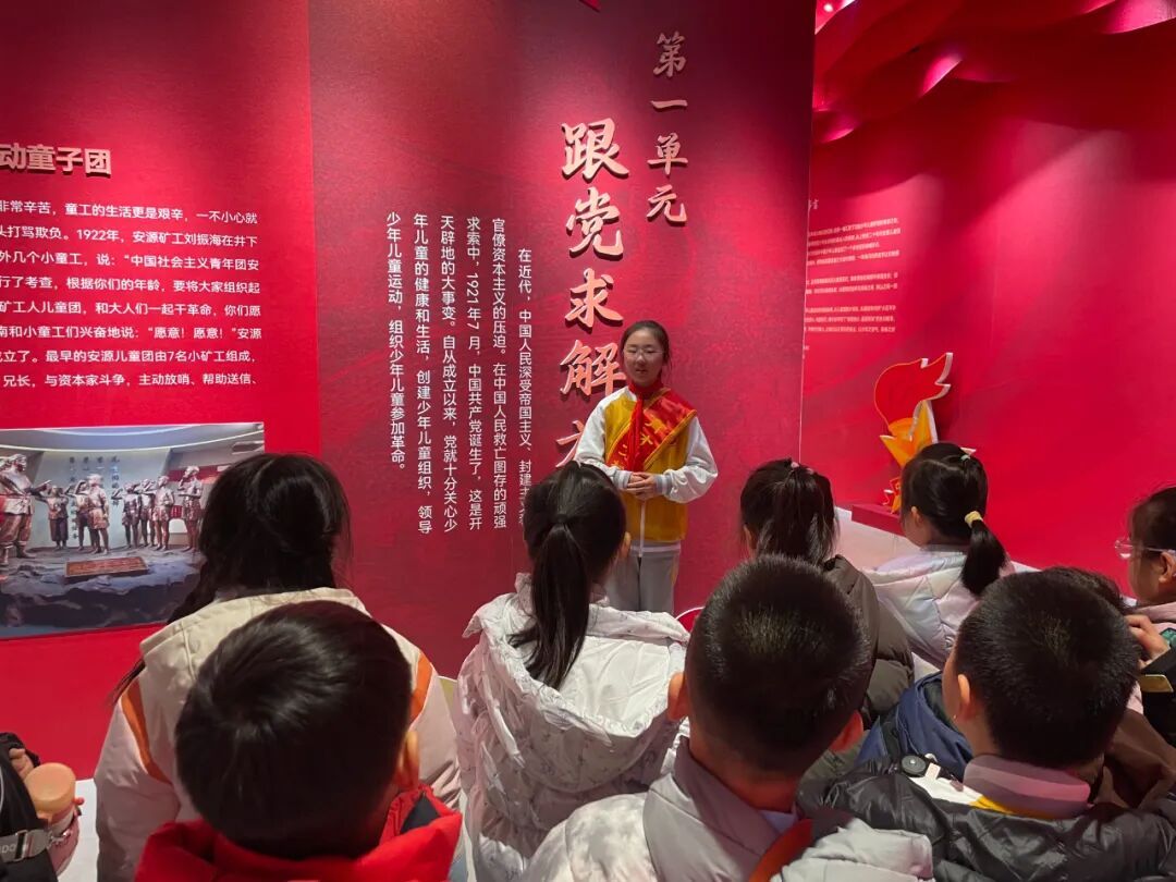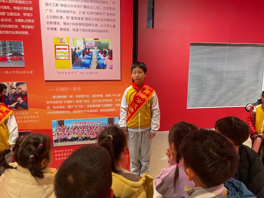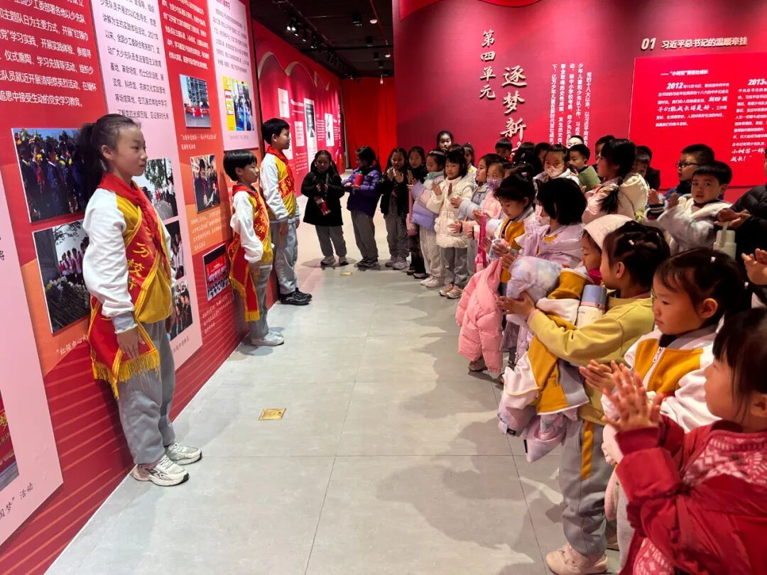 展览现场,一年级同学在班主任老师们的组织和带领下跟随小讲解员,聆听红领巾的百年历程,目光中充满向往与崇敬。此次活动不仅是一次生动的队前教育,更是一场温暖的传承接力,在讲述与聆听之间,少先队的使命与荣光深深扎根于孩子们心中。