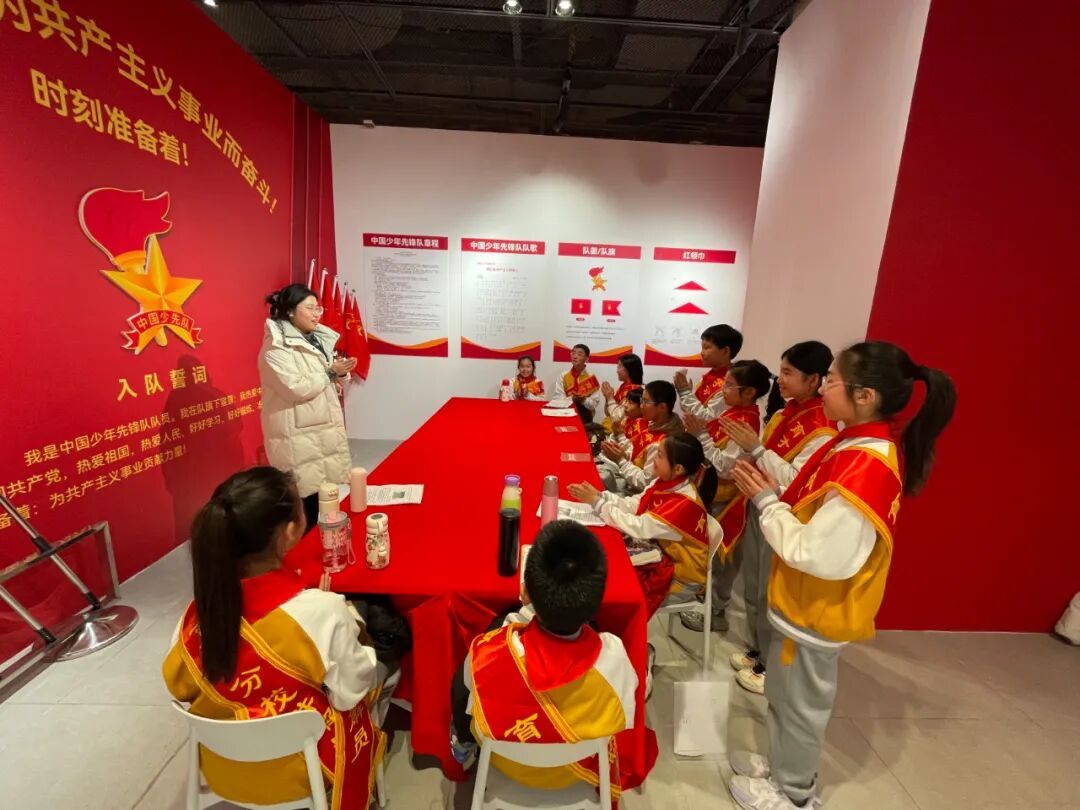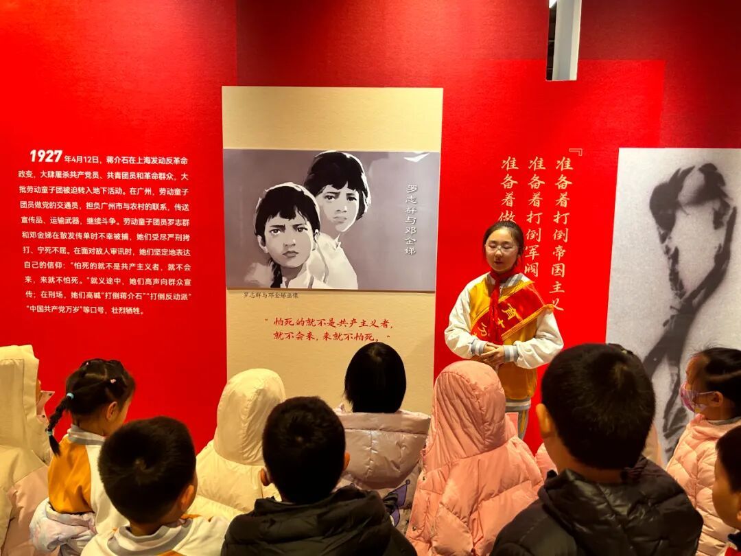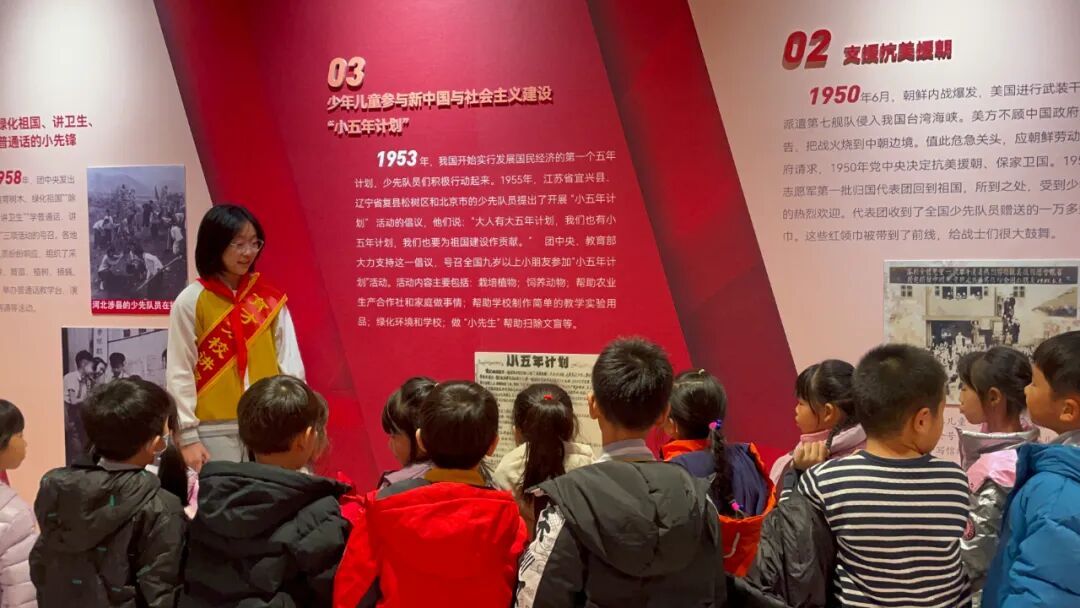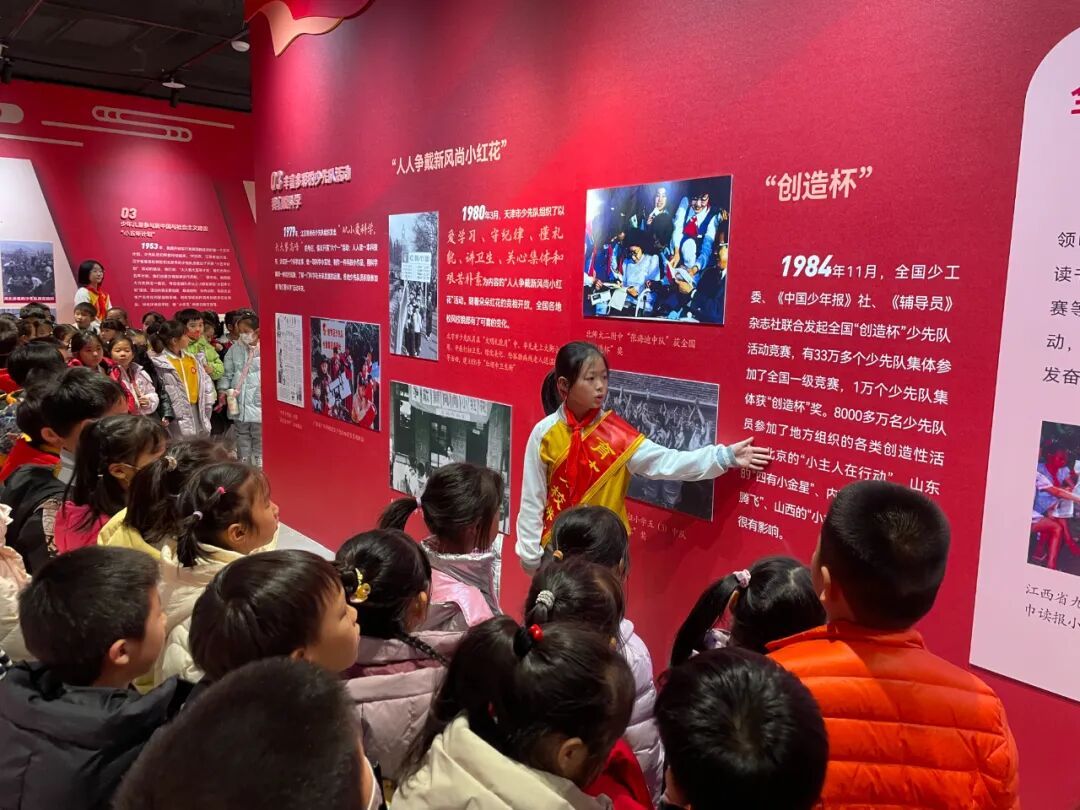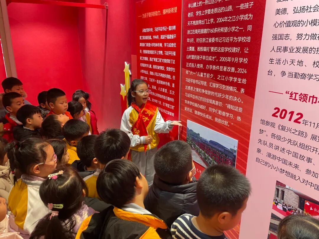 展览现场,一年级同学在班主任老师们的组织和带领下跟随小讲解员,聆听红领巾的百年历程,目光中充满向往与崇敬。此次活动不仅是一次生动的队前教育,更是一场温暖的传承接力,在讲述与聆听之间,少先队的使命与荣光深深扎根于孩子们心中。