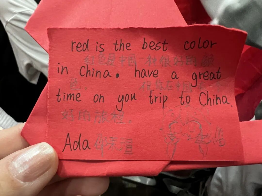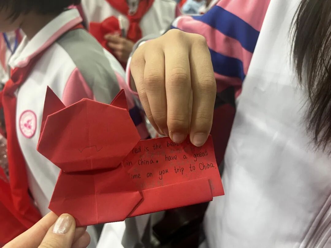 八一学校少先队员邵茉萱用心给越南小伙伴准备了一个可爱小猫造型的红色书签,上面用中英双语写着祝福:“红色是中国一种很好的颜色,祝你在中国有一个好的旅程。”