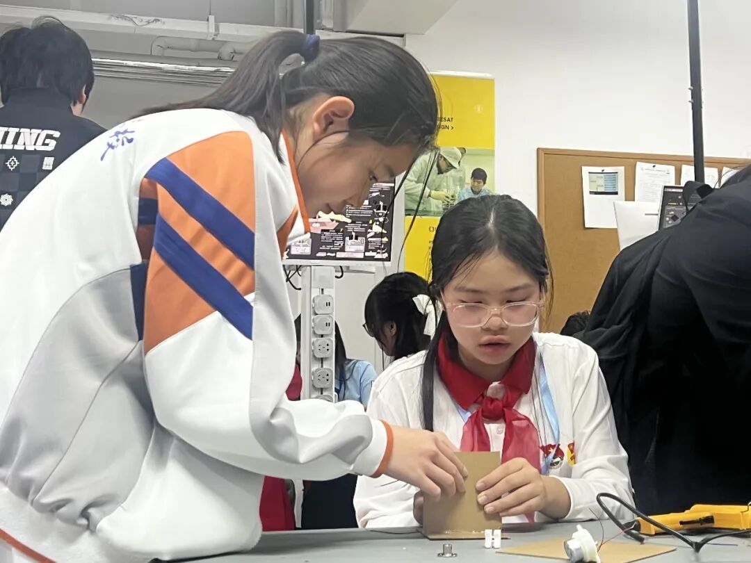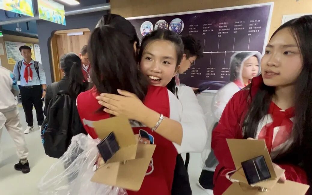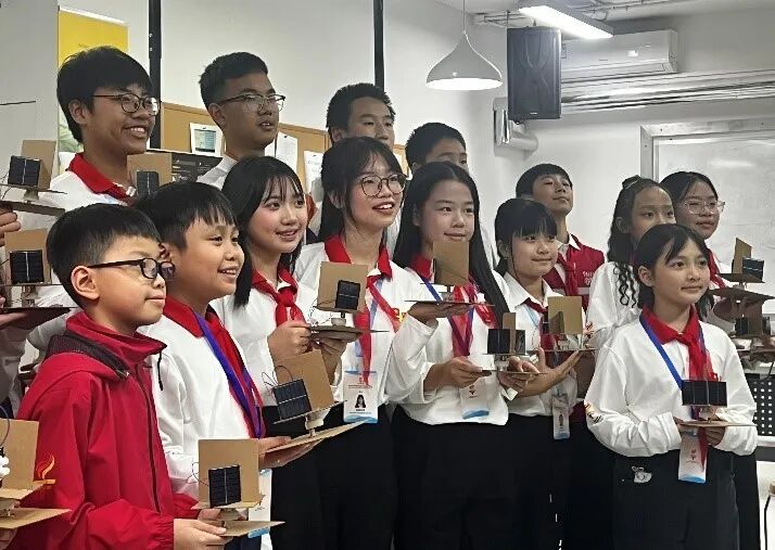 在学校的“开物苑”,中越少先队员并肩而坐,“同上一堂科学课”,合作组装“太阳能对日定向装置”,让交流更加生动。尽管语言不通,但孩子们通过手势、微笑和简单的单词愉快地交流。当装置成功实现自动追光时,现场响起了阵阵笑声和掌声。