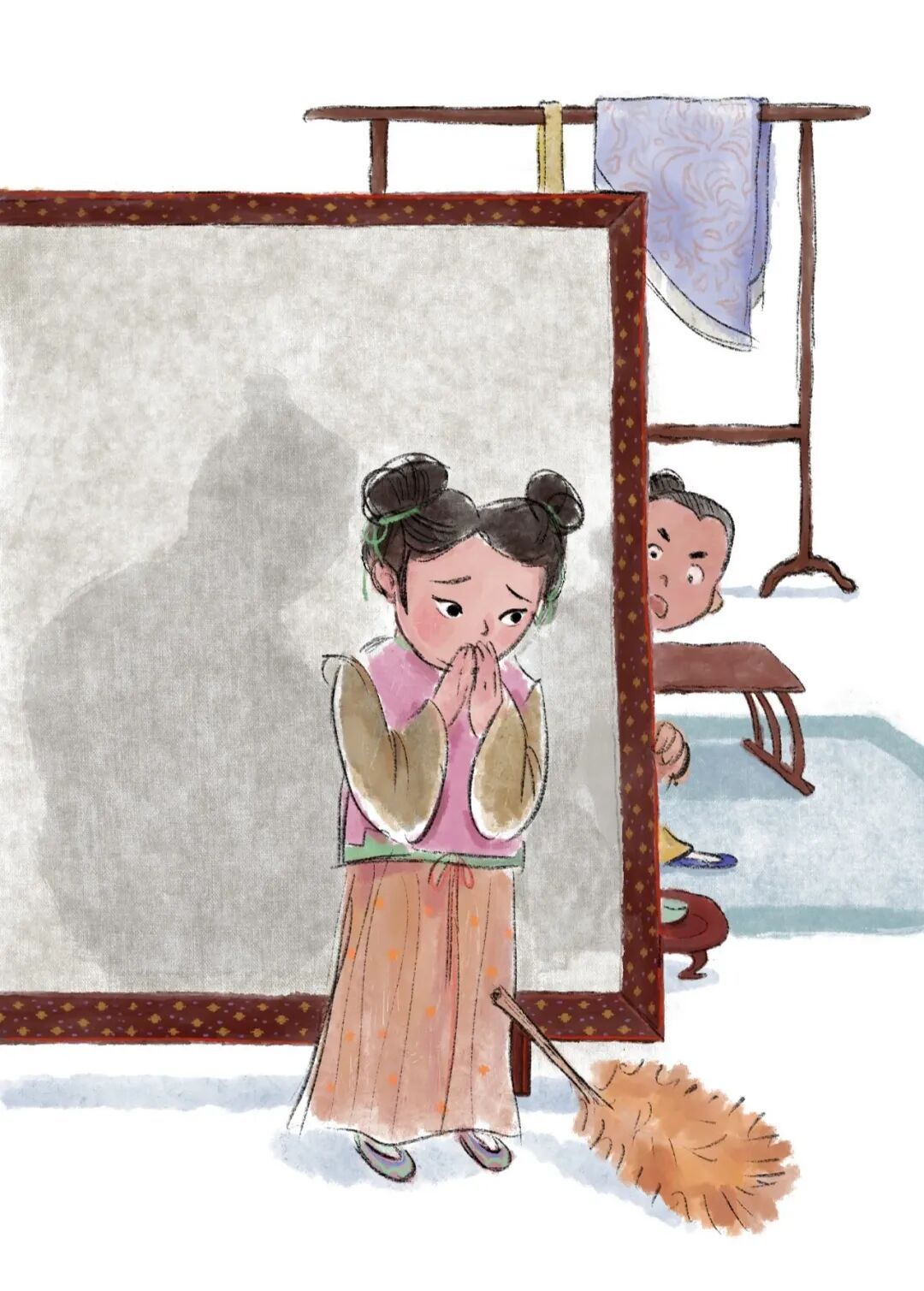 不仅如此,书中的服饰、建筑、家具也藏着很多细节:主角作为“驯服异兽的猎人”,服饰采用古代猎户的“短打扮”;家具陈设则参考汉代的几案、衣架、灯具——从细节处传递中国审美,让孩子在阅读中潜移默化感受传统文化之美。