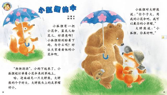 小狐狸对大胖熊说:“你个子大,用我的小花伞吧,我可以戴你的小草帽。”