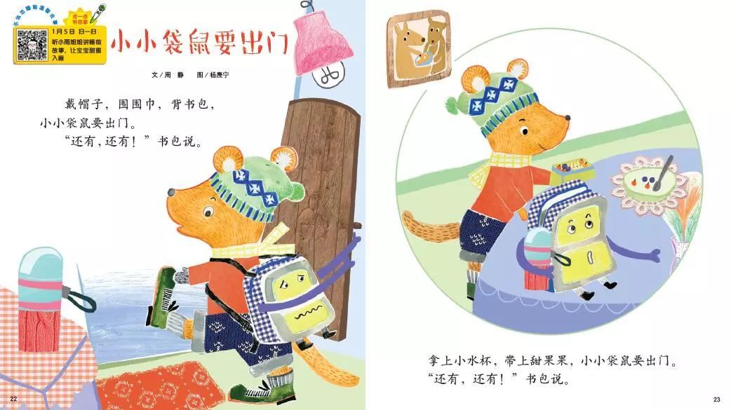 戴帽子,围围巾,背书包,带上了小水杯,带上了甜果果,跳进妈妈的大口袋,小小袋鼠出门去。