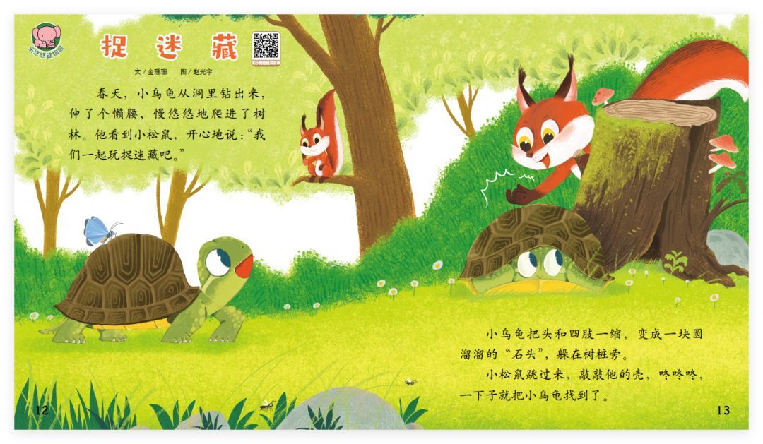 小松鼠跳过来,敲敲他的壳,咚咚咚,一下子就把小乌龟找到了。