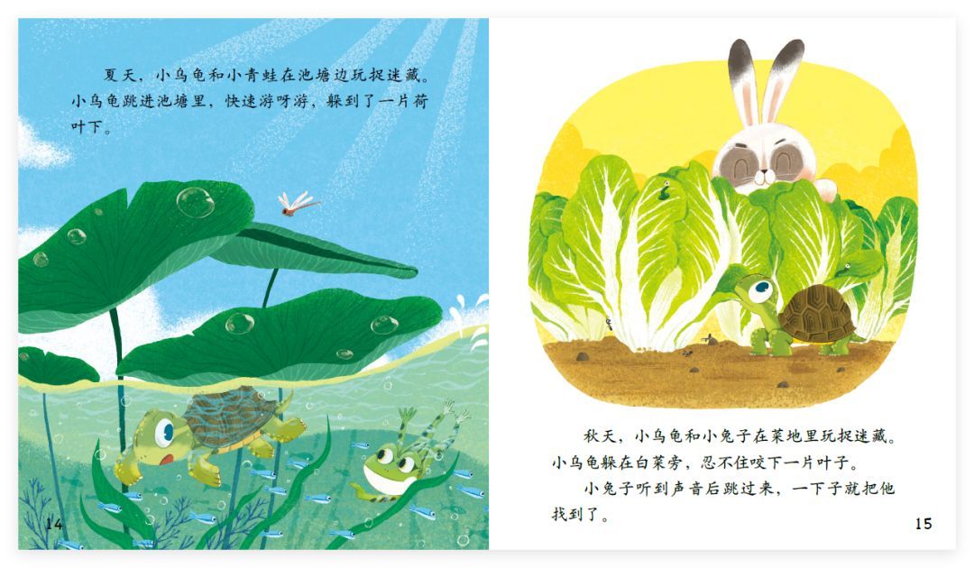 夏天,小乌龟和小青蛙在池塘边玩捉迷藏。