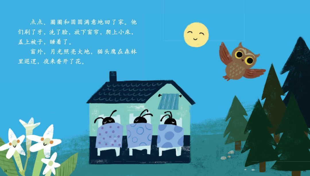 窗外,月光照亮大地,猫头鹰在森林里巡逻,夜来香开了花。